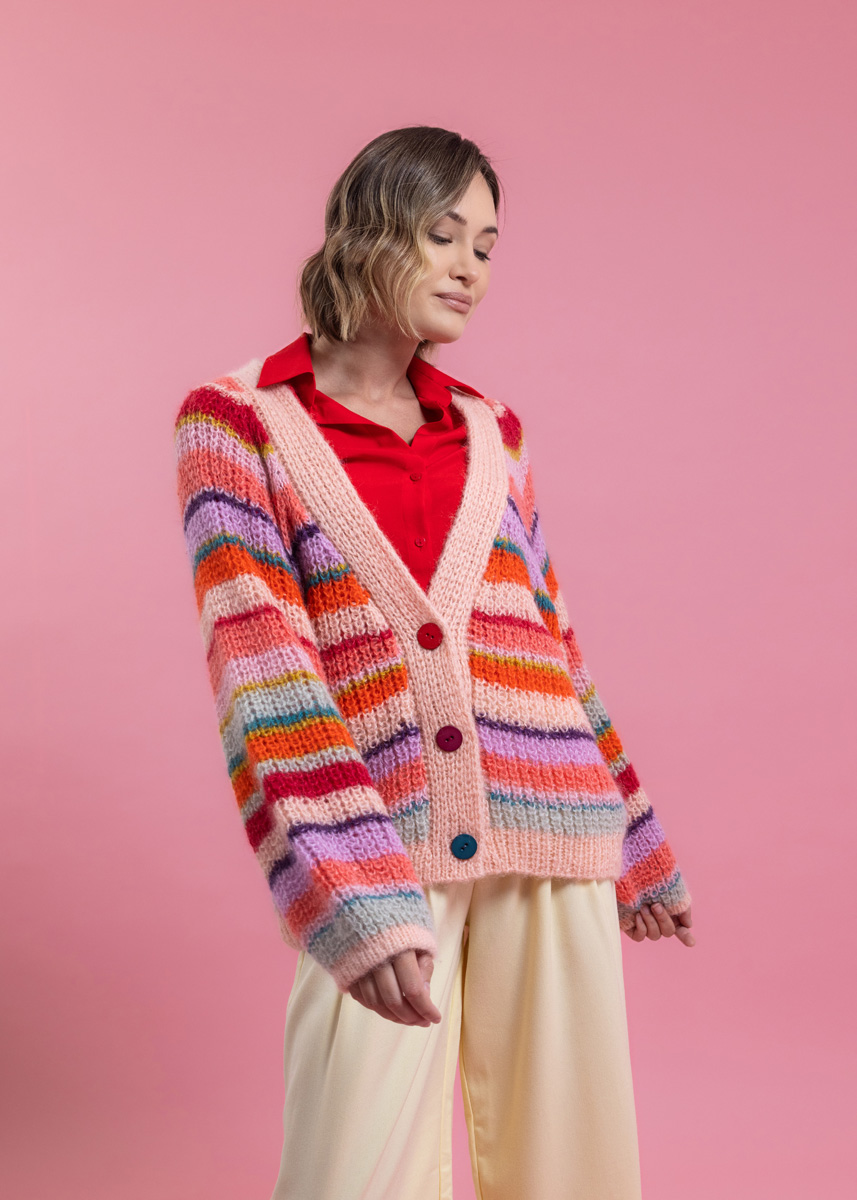 Der Cardigan wird doppelfädig und nahtlos in einem Stück von oben nach unten gestrickt. Die Blende wird dreifädig separat gestrickt und angenäht. Das Modell hat eine Gesamtlänge von 60 (62 - 64 - 66 - 68 - 70) cm und eine Brustmehrweite von 26 cm bei 80 cm Brustumfang (26 cm bei 88 cm Brustumfang - 26 cm bei 96 cm Brustumfang - 30 cm bei 104 cm Brustumfang - 28 cm bei 116 cm Brustumfang - 22 cm bei 128 cm Brustumfang).