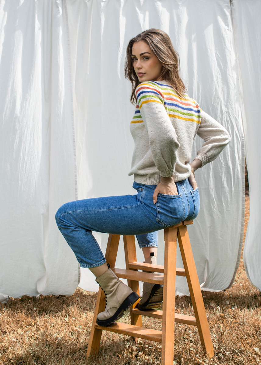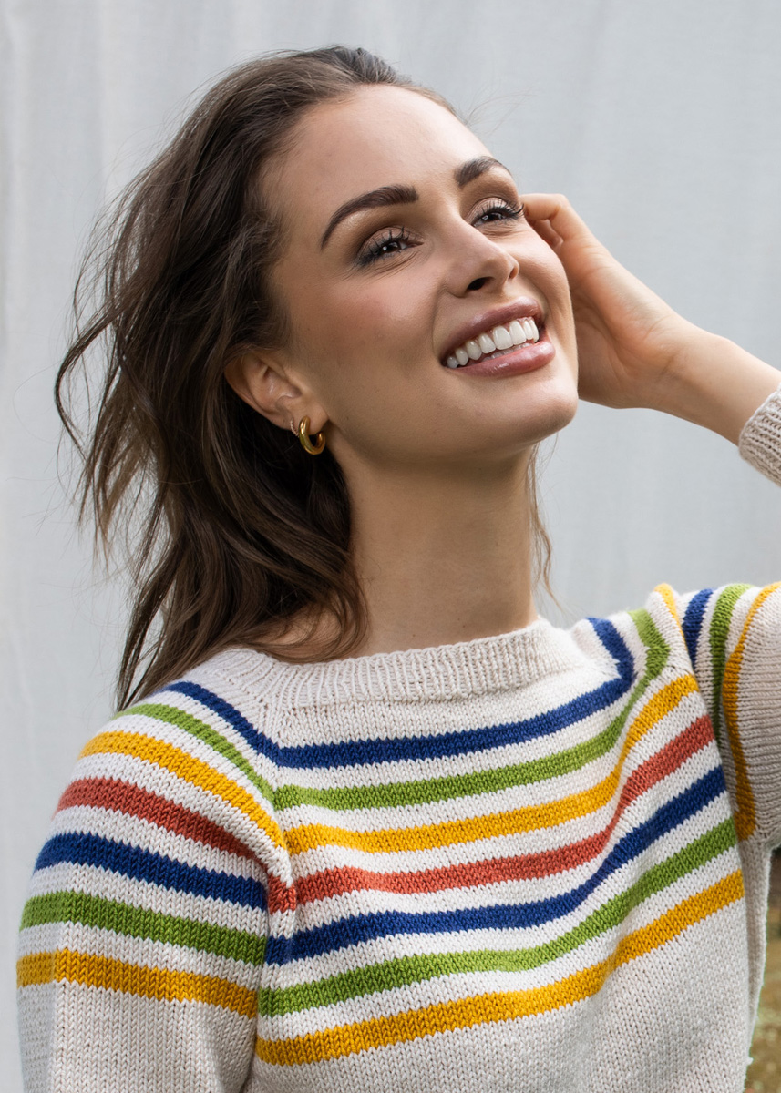 Der Pullover wird nahtlos in einem Stück von oben nach unten gestrickt und hat eine Gesamtlänge von 54 (56 - 58 - 60 - 62 - 64) cm und eine Brustmehrweite von 10 cm bei 80 (88 - 96 - 104 - 116 - 128) cm Brustumfang.