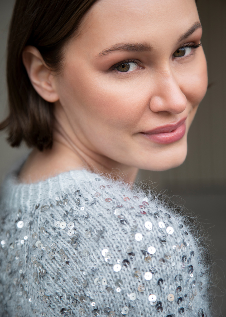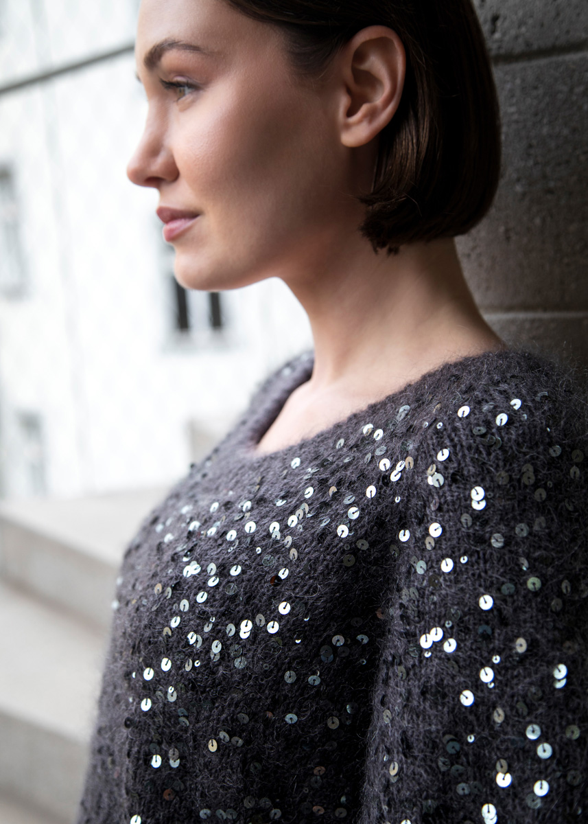 Das Model trägt Größe 34/36. Die hellgraue Variante wurde in Größe 36/38 gestrickt, die dunkelgraue Variante in 40/42.