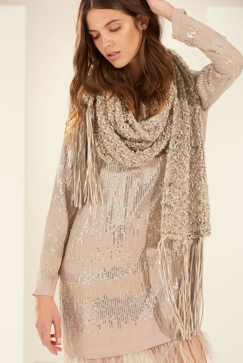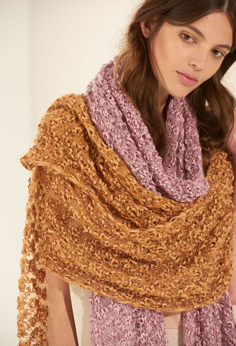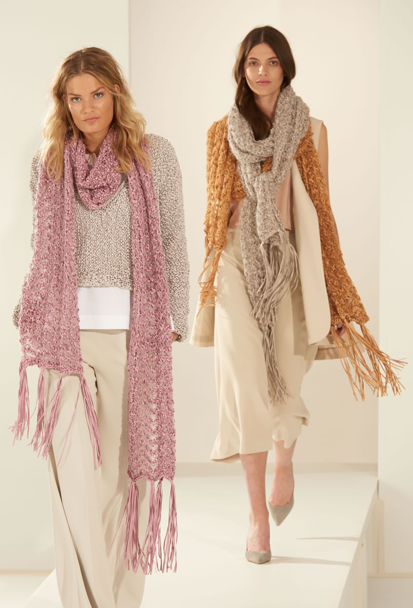 Lana Grossa Alcanto (70 % Polyester, 30 % Polyamid, Lauflänge 130 m/50 g) 150 g Hellbeige (Fb 1), Altrosa (Fb 2), Safrangelb (Fb 9) oder Dunkelgrau (Fb 10); Silkhair (70 % Mohair, 30 % Seide, Lauflänge 210 m/25 g) 50 g Zartlila (Fb 87), Cognac (Fb 95) oder Dunkelgrau (Fb 12) oder Silkhair Mélange (70 % Mohair, 30 % Seide, Lauflänge 210 m/25 g) 50 g Natur/Grège meliert (Fb 701); Stricknadeln Nr. 8, Häkelnadel Nr. 7.