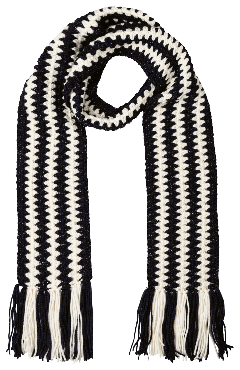 Lana Grossa Qualität „Alta Moda Cashmere 16“ (78% Schurwolle Merino, 12% Kaschmir, 10% Polyamid, LL= 110 m/50 g): 200 g Nachtblau (Fb. 11), 150 g Rohweiß (Fb. 16) und Lana Grossa Qualität „Brillino“ (83% Viskose, 17% Metallische Faser, LL= 200 m/25 g): 50 g Schwarz/Silber (Fb. 13), Häkelnadel Nr. 6.