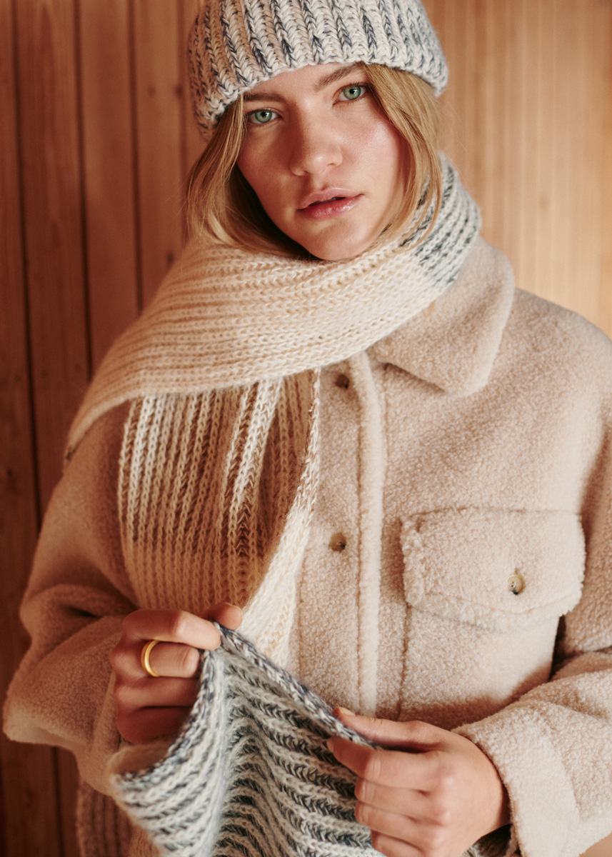 Wer etwas Zeit mitbringt, wird am Ende mit dieser schicken Kombination aus Schal und Mütze belohnt. Das zweifarbige Patentmuster erfordert gute Kenntnisse und wird mehrfädig aus ECOPUNO & SETASURI gestrickt.