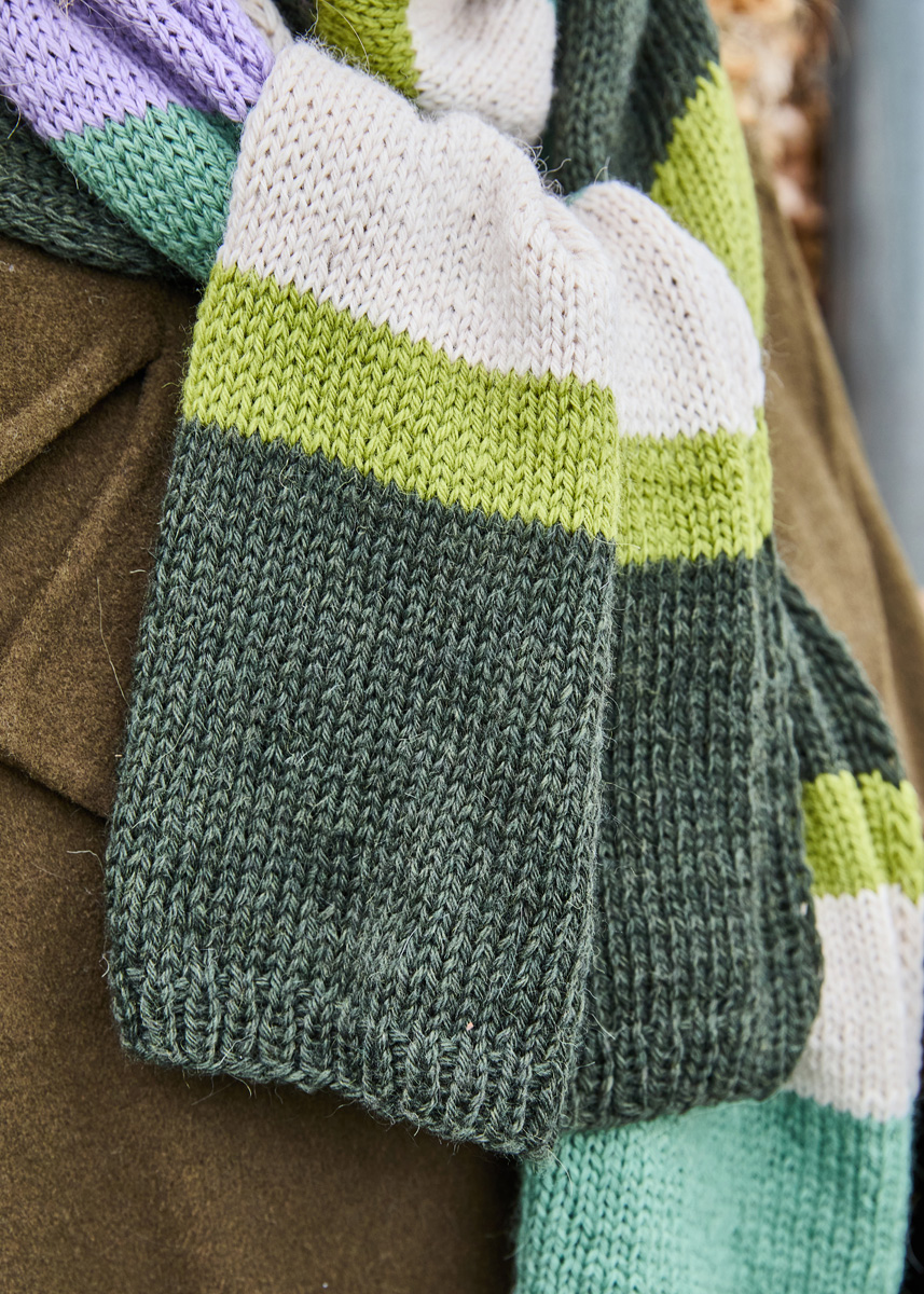 Lana Grossa-Qualität „Landlust- Alpaka-Merino 160“ (50% Schurwolle (Merino), 50% Alpaka (Baby), LL ca. 160 m/50 g), je 50 g in Hellbeige (Fb 402), Kiwigrün (Fb 443), Schilfgrün (Fb 432), Moosgrün (Fb 423) und Flieder (Fb 440); Stricknadeln Nr. 4,5.