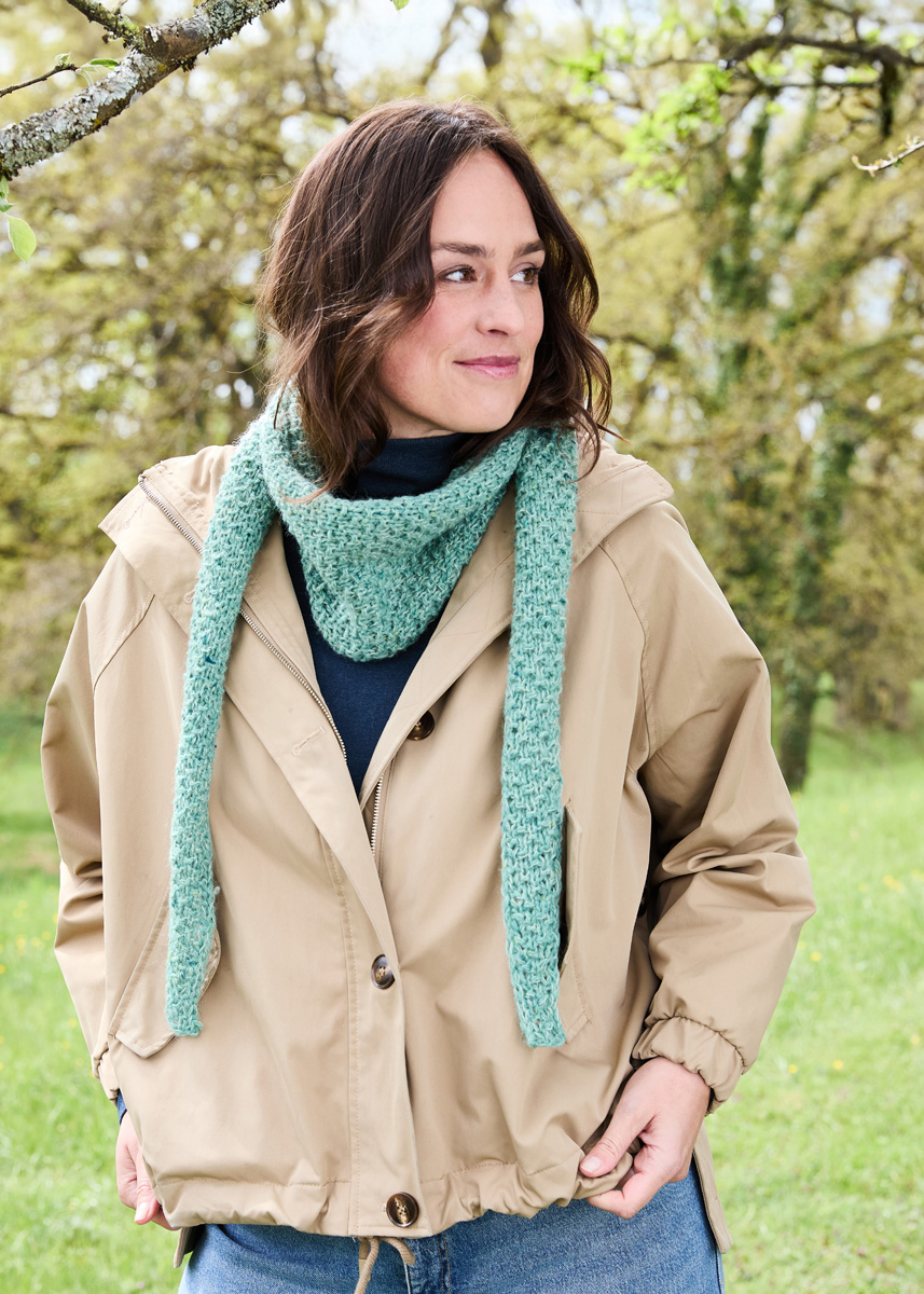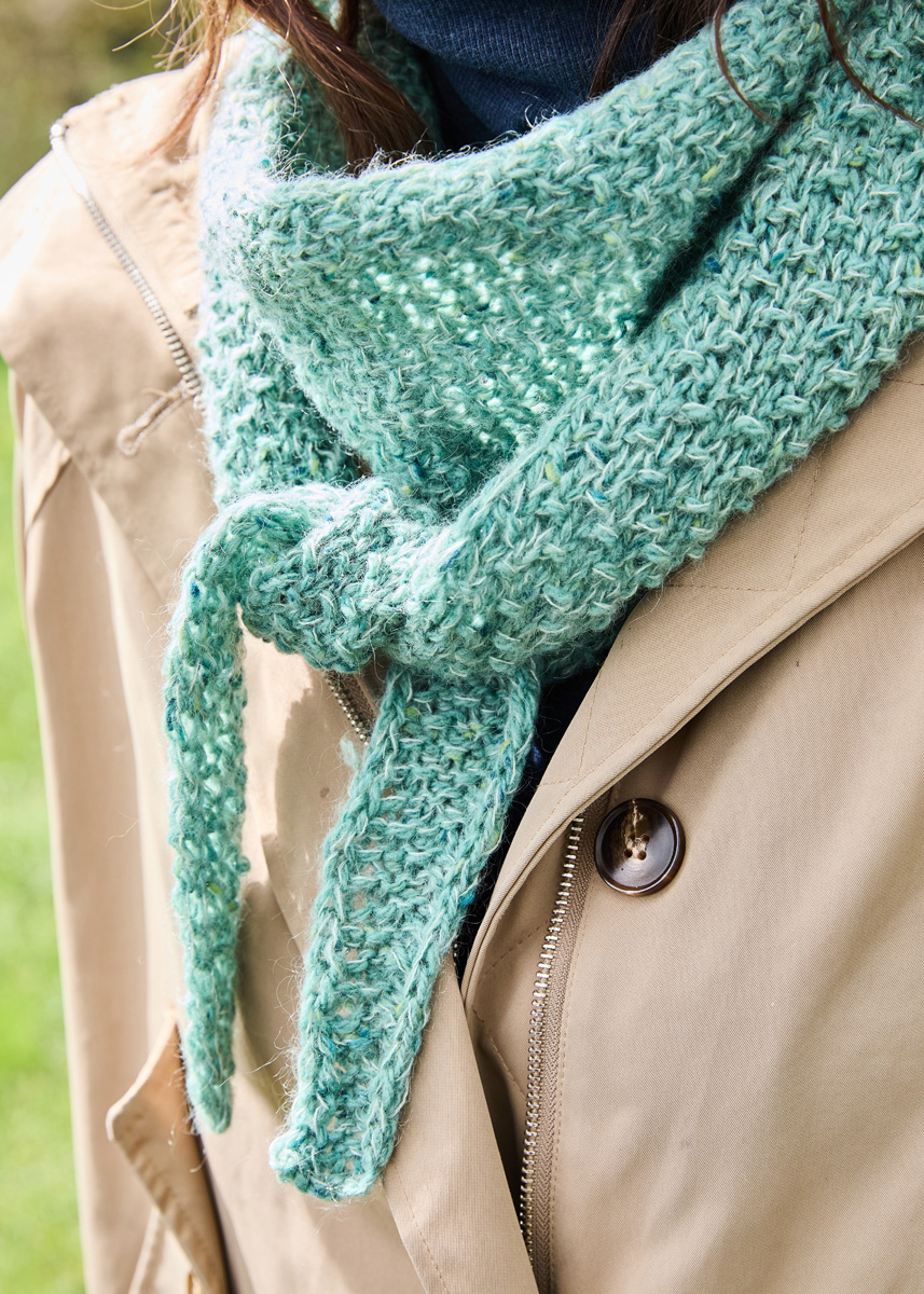 Hinweis: Das Dreieckstuch wird 2-fädig mit je 1 Faden in Jade Meliert und 1 Faden in Mintgrün an einer Spitze begonnen und die Zunahmen werden nur am rechten Rand gearbeitet.