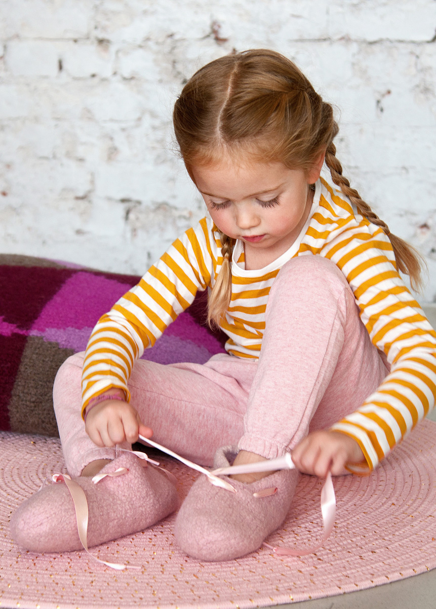 Vor dem großen Auftritt steht noch die Herausforderung, endlich eine Schleife binden zu können. Wenn das noch gar nicht klappt, kann man auf die Hausballerinas mit glitzerndem Gummiband ausweichen und in ein paar Monaten nochmal neu probieren. Rutschsicher werden die Schuhe durch flüssige Latexmilch, die punktuell auf die Sohle aufgetragen wird. Dann klappt´s auch unfallfrei mit den Pirouetten.