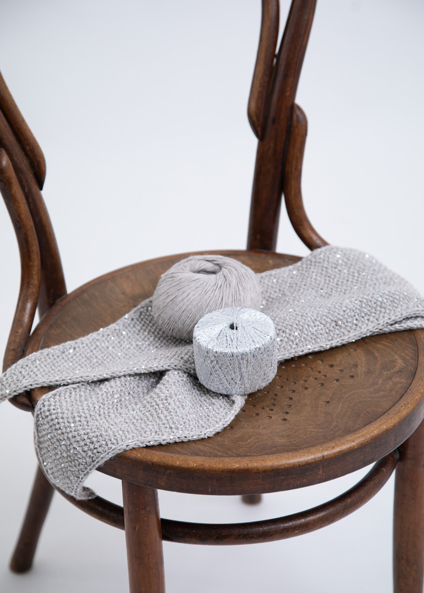 Hinweis: Jedes Tuch wird durchgehend doppelfädig mit je einem Faden Ecopuno und Glamour gestrickt.
