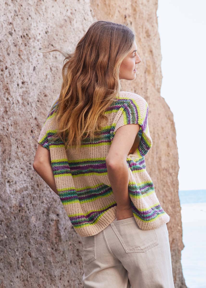 Extraweit, im Halbpatentmuster und mit Streifen im Farbverlauf: Dieses Shirt gefiel uns so gut, dass wir es in zwei verschiedenen Varianten stricken mussten. Seine gerade Silhouette ist anfängerfreundlich, der Ausschnitt entsteht durch betonte Abnahmen.