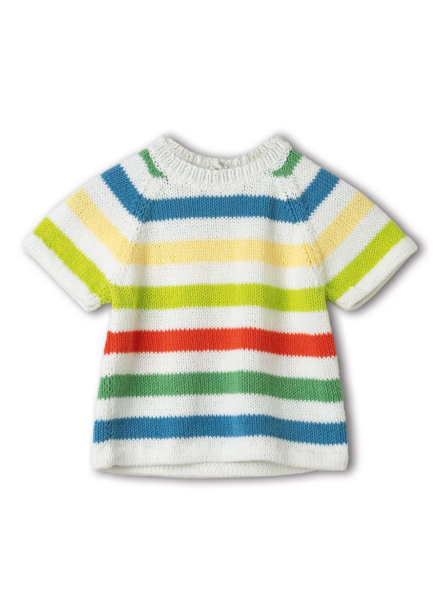 Lana Grossa Elastico (96 % Baumwolle, 4 % Polyester (elité); LL = 160 m/50 g): 50 (100/100/100) g Ecru (Fb. 36) und je 50 (50/50/50) g Apfelgrün (Fb. 181), Gelb (Fb. 41), Limette (Fb. 188), Azurblau (Fb. 184) und Hummer (Fb. 186); je eine Rundstricknadel 3 mm und 3,5 mm; 8 entfernbare Markierer (oder Sicherheitsnadeln); 1 geschlossener Markierer; 3 Kunststoff-Druckknöpfe zum Annähen mit 7 mm Ø.