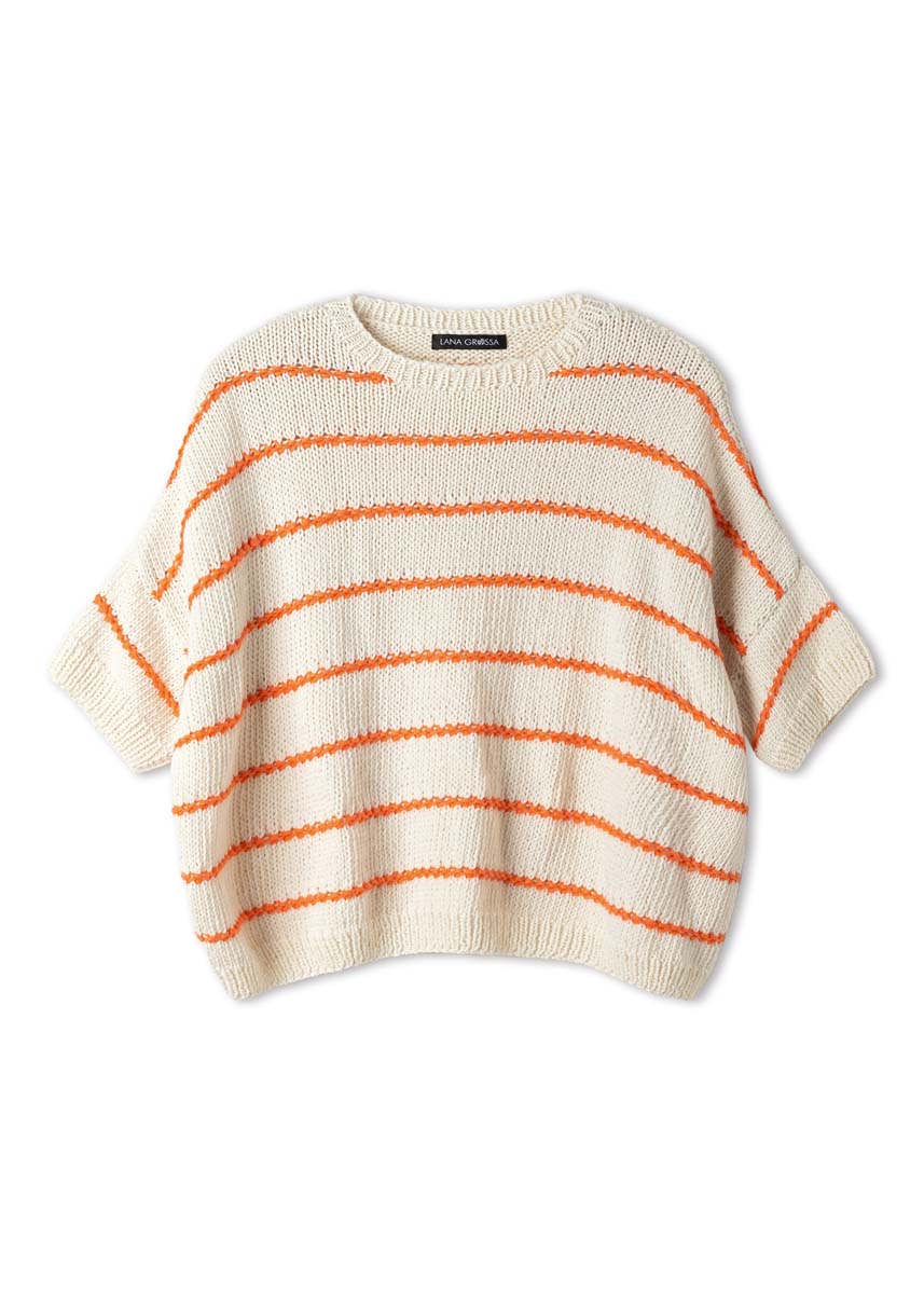 Lana Grossa-Qualität „Summer Softness“ (80 % Baumwolle (Bio), 20 % Schurwolle (Merino Superfine), LL = ca 130 m/50 g): ca 300 (350 - 350 - 400) g Creme (Fb 2) und ca 50 (50 - 100 - 100) g Kürbis (Fb 6); Stricknadeln Nr 5 und Nr 7; 1 Rundstricknadel Nr 5.