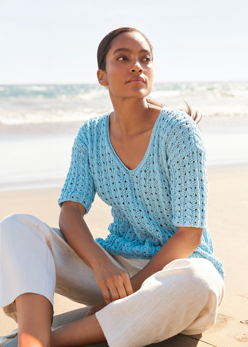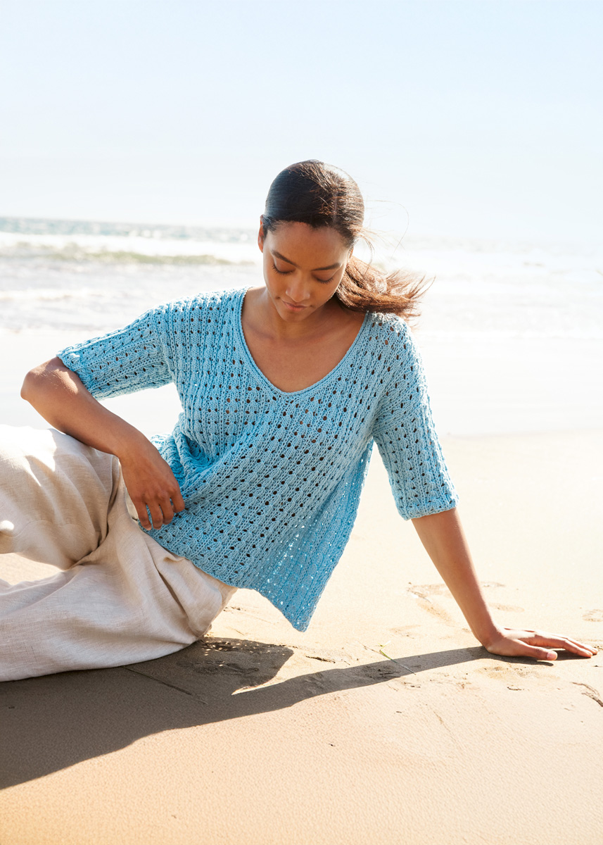 Frutti di Mare – Strandläuferinnen lieben das locker sitzende SHIRT, dessen plastisches Lochmuster an Muscheln erinnert, und freuen sich über etwas Wärme nach einem Tag am Meer.