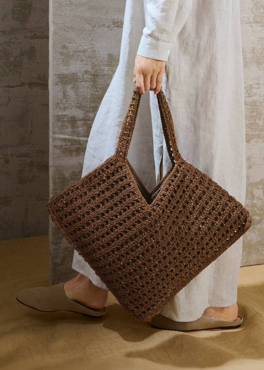 Lana Grossa „The Core“ (50% Baumwolle, 50 % Polyester, LL = 85 m/100 g): 400 g Dunkelbraun (Fb 14) und Lana Grossa „Glamour“ (55% Polyamid, 45% Polyester, LL = 115 m/25 g): 100 g Mokkabraun (Fb 14), Häkel-Nd Nr 5.