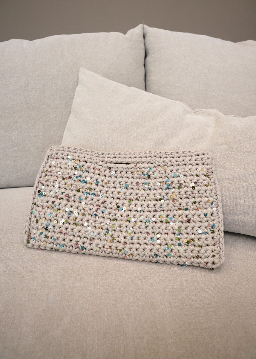 Lana Grossa „The Tube“ (60% Baumwolle, 40% Nylon, LL = 114 m/200 g): 200 g Graubeige (Fb 15), Lana Grossa „Cosmo“ (100% Baumwolle (plus Pailletten), LL = 260 m/100 g): 100 g Hellbeige (Fb 11); 4 Maschenmarkierer; Häkel-Nd Nr 9.