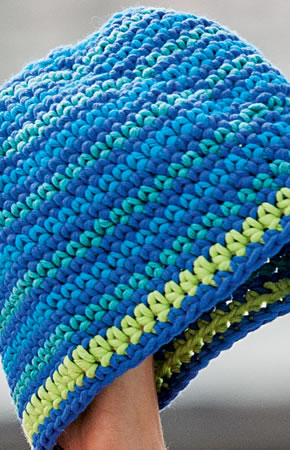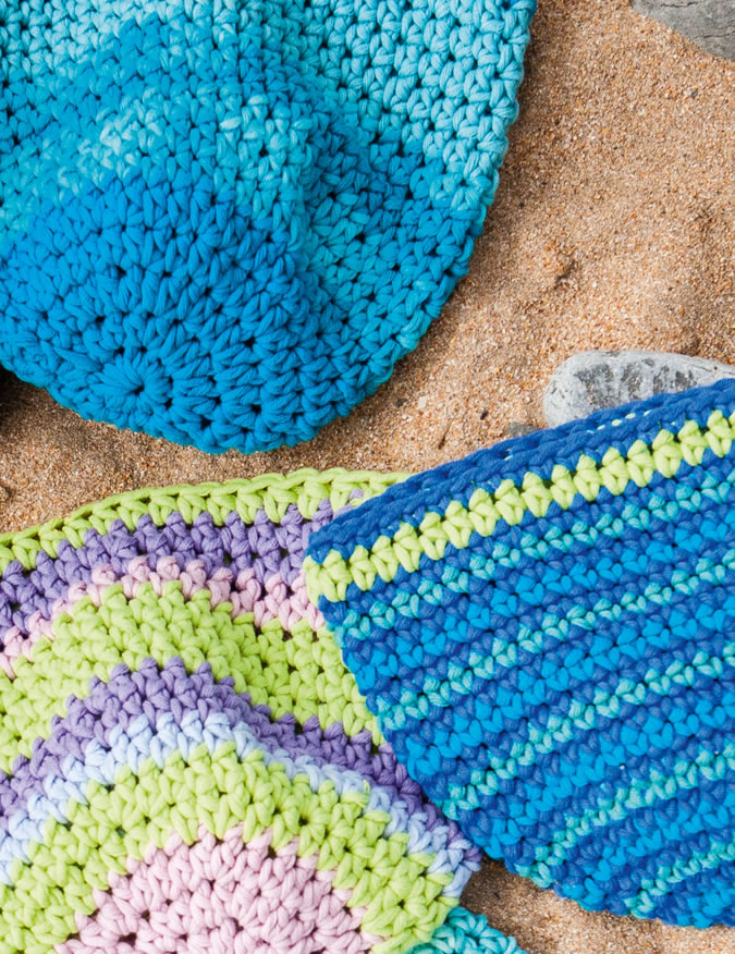 Lana Grossa McWool Cotton Mix 80 (50 % Baumwolle, 50 % Acryl; Lauflänge 80 m/50 g); je 50 g Kobaltblau (Fb 522), Petrol (Fb 521), Gelbgrün (Fb 519), Türkisblau (Fb 506); Häkelnadel Nr. 6.