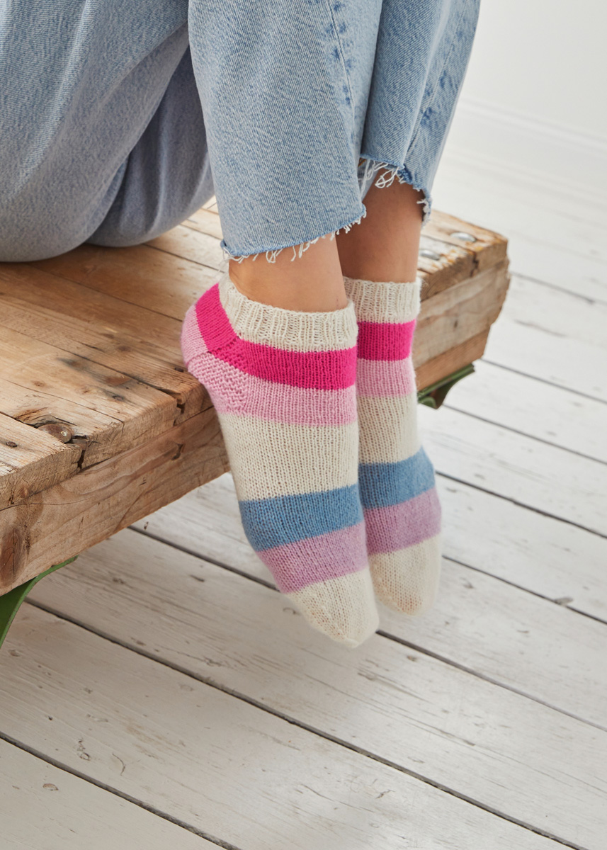 Ein Paar behalten, zwei Paar verschenken – oder umgekehrt? Einfach noch je ein 50g-Knäuel in Rohweiß und Nelke ergänzen und das Restmaterial reicht für alle drei Sockenpaare!