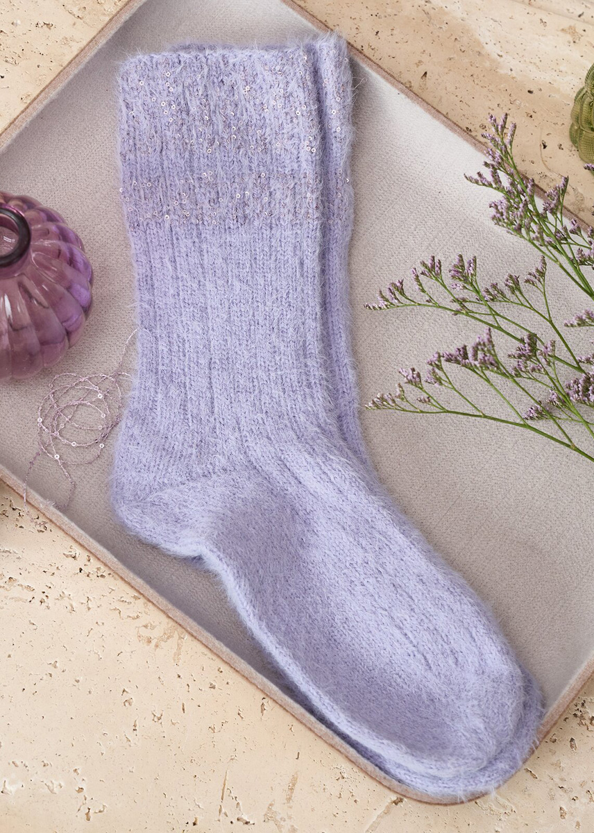 Lana Grossa-Qualität Cosy Socks (70% Schurwolle (Merino), 30% Polyamid, LL = ca. 400 m/100 g): 100 g Fliederlila (Fb 3) und Glamour (55% Polyamid, 45% Polyester, LL = ca. 115 m/25 g): 25 g Graulila (Fb 2); ein Nadelspiel Nr 2,5.