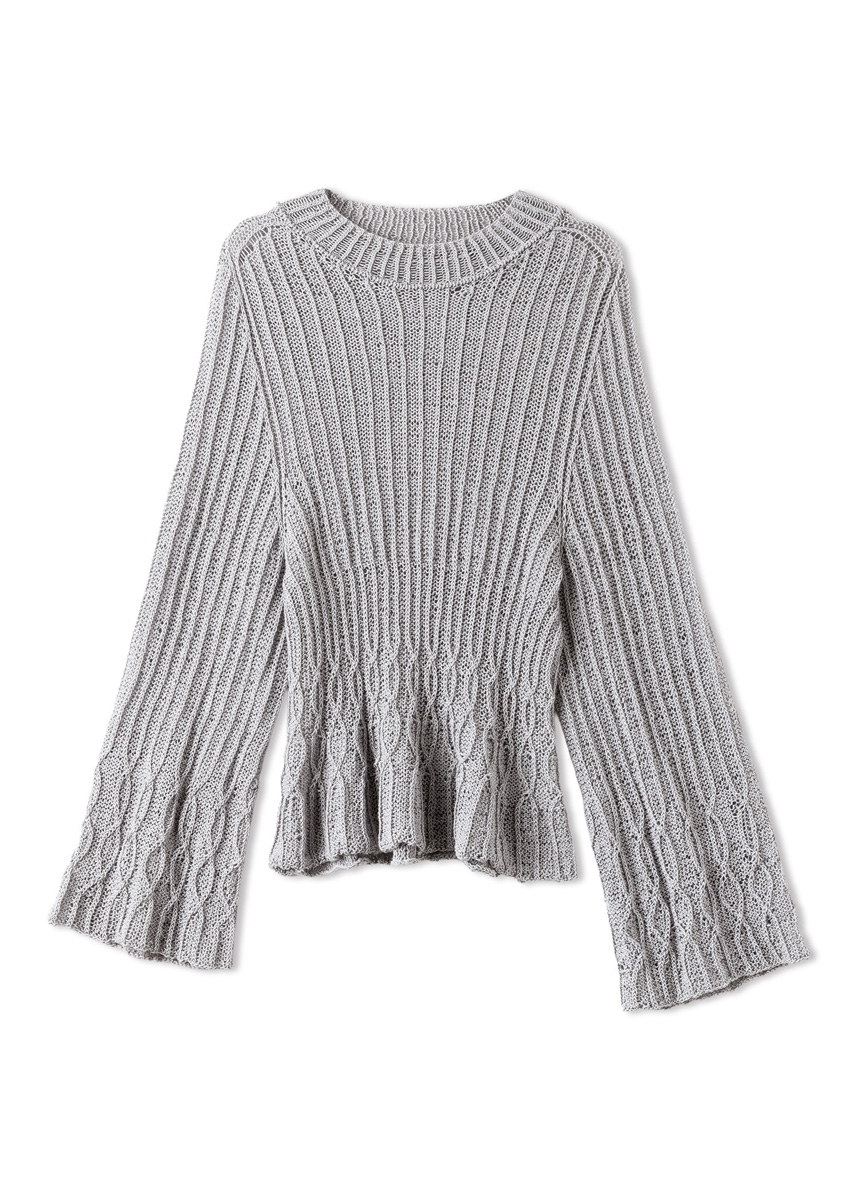 Lana Grossa-Qualität „Filo Lurex“ (94 % Baumwolle, 6 % Polyester, LL = ca 145 m/50 g): ca 400 g Hellgrau (Fb 14); kurze und lange Rundstricknadel Nr 3 und 3,5; je 2 Maschenmarkierer in 2 unterschiedlichen Farben; 1 Zopfnadel.
