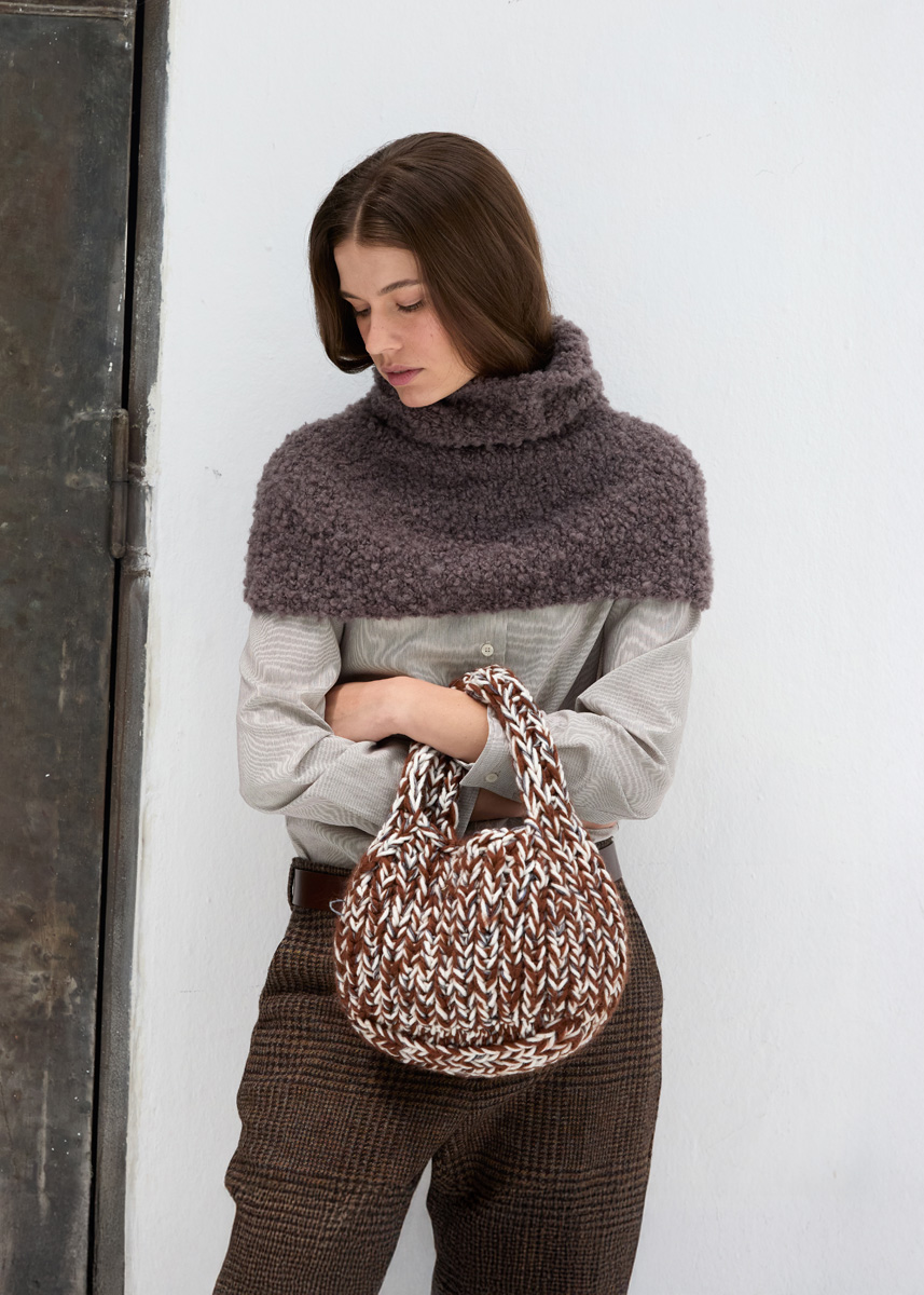 Lana Grossa „Mille II“ (50% Schurwolle (Merino), 50% Polyacryl, LL = 55 m/50 g): 150 g Rohweiß (Fb 17), Lana Grossa „Per Lei“ (100% Schurwolle (Merino), LL = 60 m/ 50 g): 150 g Schokobraun (Fb 47) und Lana Grossa „Cool Wool Vintage“ (100% Schurwolle (Merino extrafine), LL = 160 m/50g): 50 g Dunkelgrau (Fb 7391); Rundstrick-Nd Nr 9, Hilfs-Nd; Maschenmarkierer.
