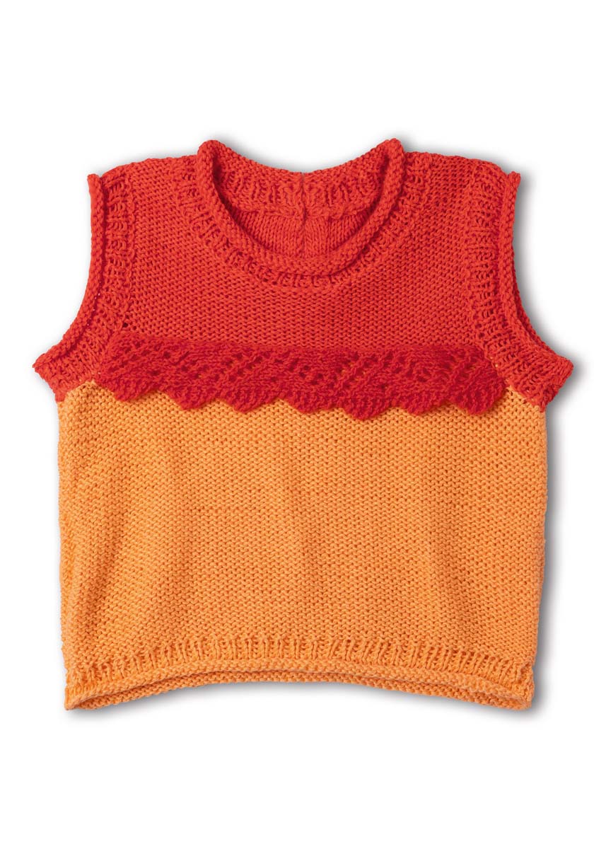 Lana Grossa Campo (65% Baumwolle, 25% Viskose, 10% Leinen; LL = 165 m/50 g): 50 (50/100/100) g Orange (Fb. 14) und 50 g Leuchtendrot (Fb. 16); Lana Grossa Sottile (85% Baumwolle, 15% Schurwolle (Merino); LL = 250 m/50 g): 50 g Leuchtendrot (Fb. 4); je eine Rundstricknadel 3,5 mm und 4 mm; Häkelnadel 3 mm; Maschenmarkierer; 1 Knopf mit 13 mm Ø.