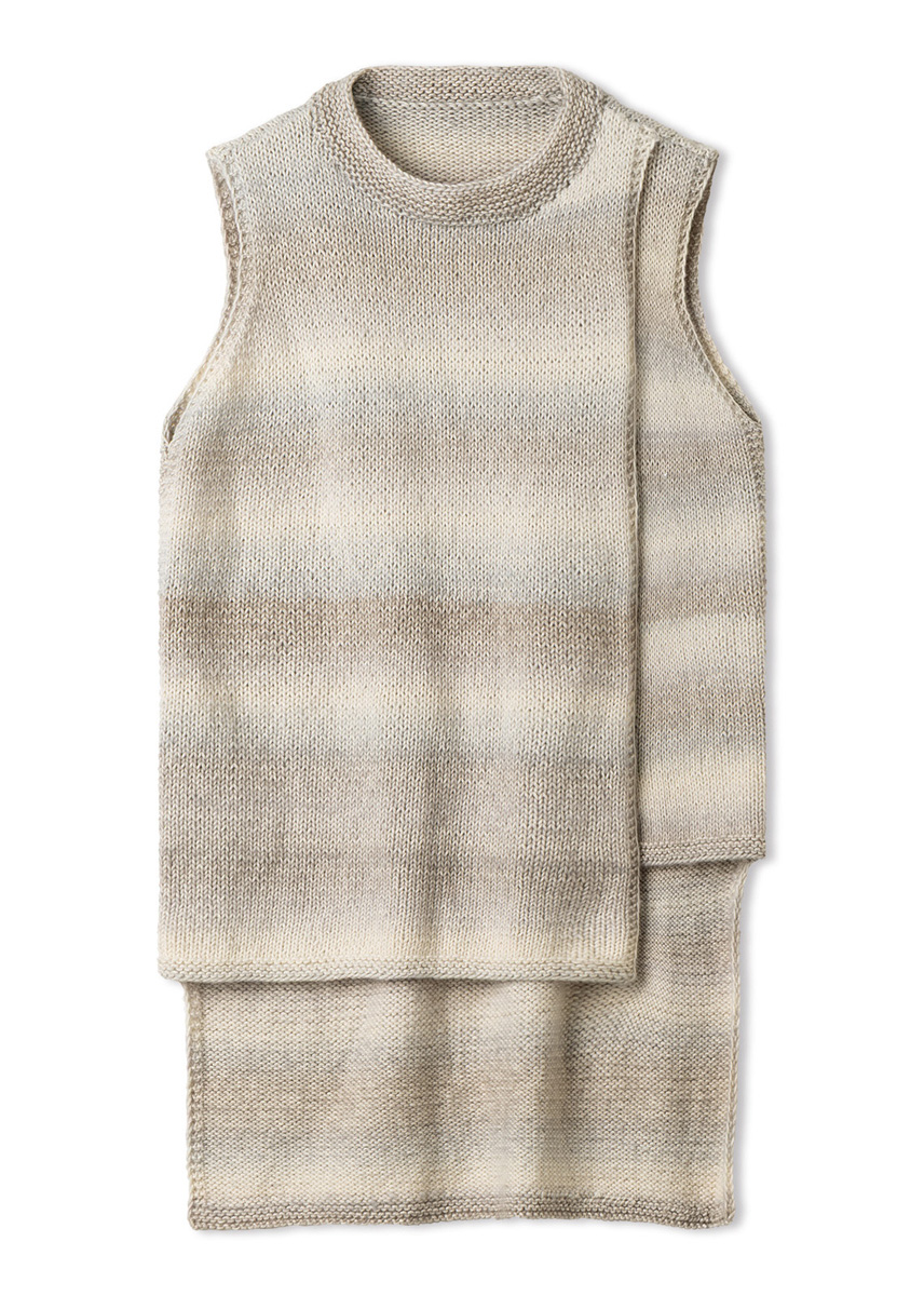 Lana Grossa-Qualität „Corallo“ (70 % Baumwolle (Bio), 30 % Schurwolle (Merino), LL = ca 210 m/100 g): ca 400 (500 - 500 - 600) g Beige/Grège/Rohweiß (Fb 10); Stricknadeln Nr 4 und Nr 4,5; kurze Rundstricknadel Nr 4.