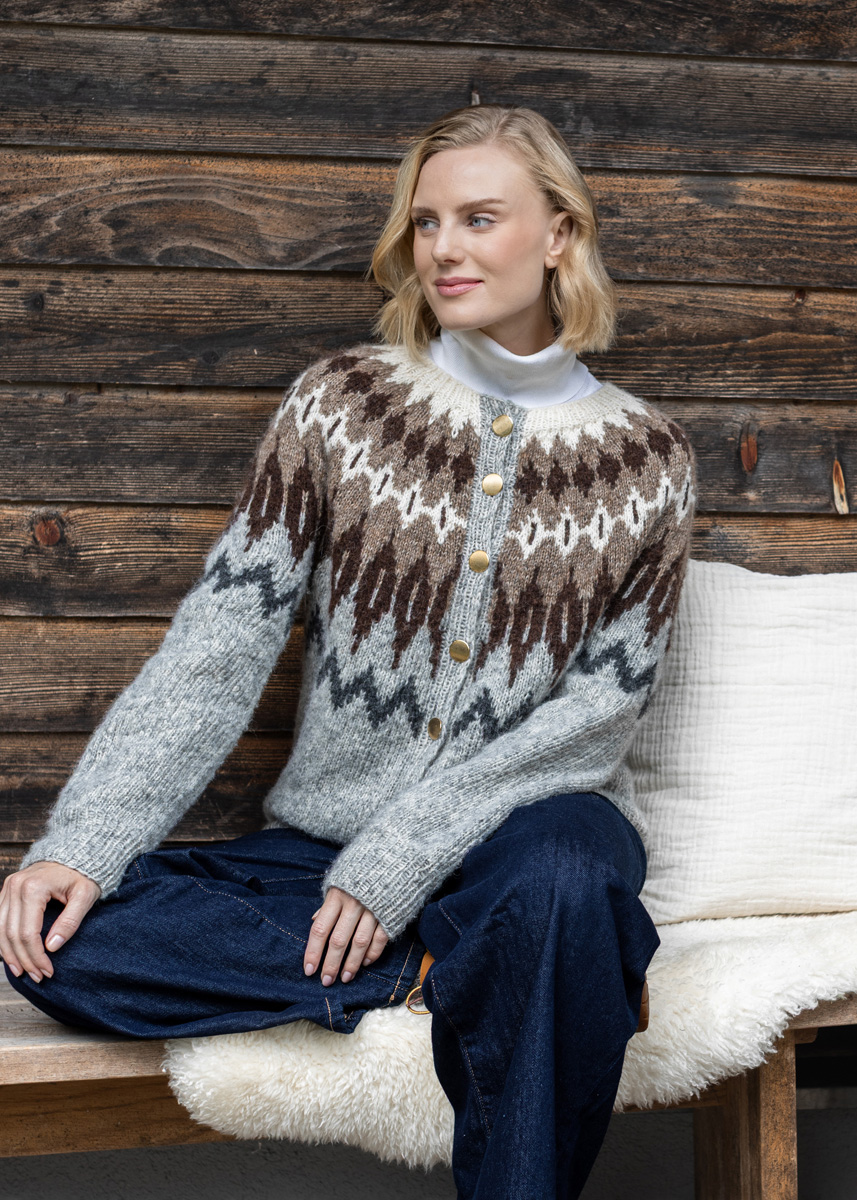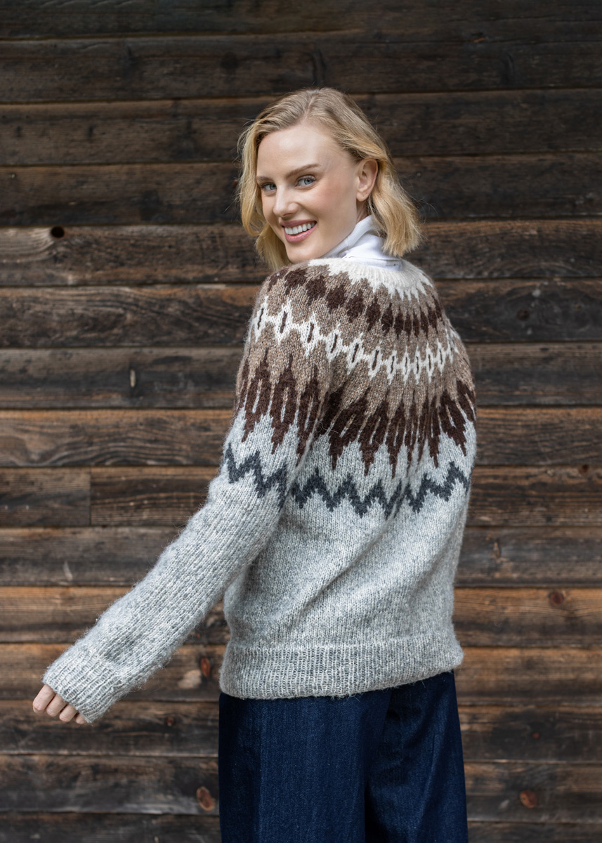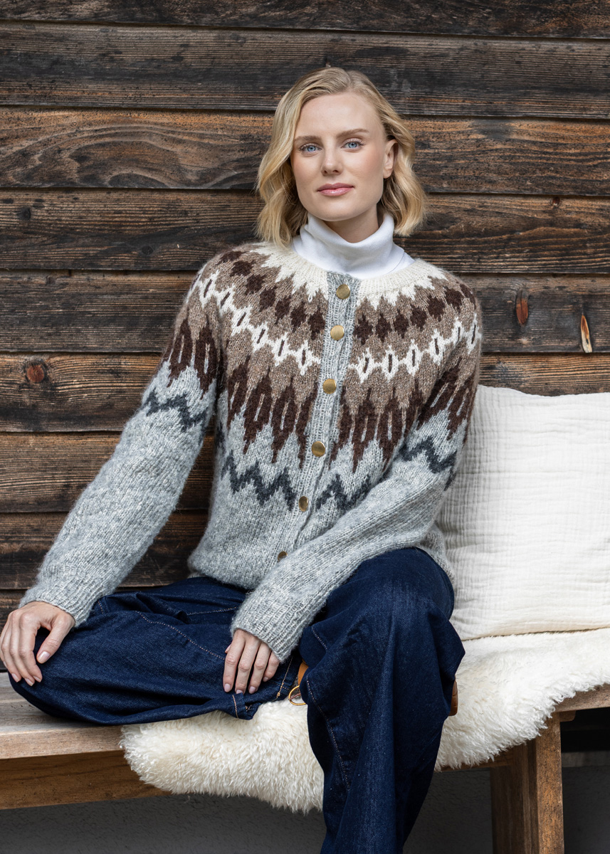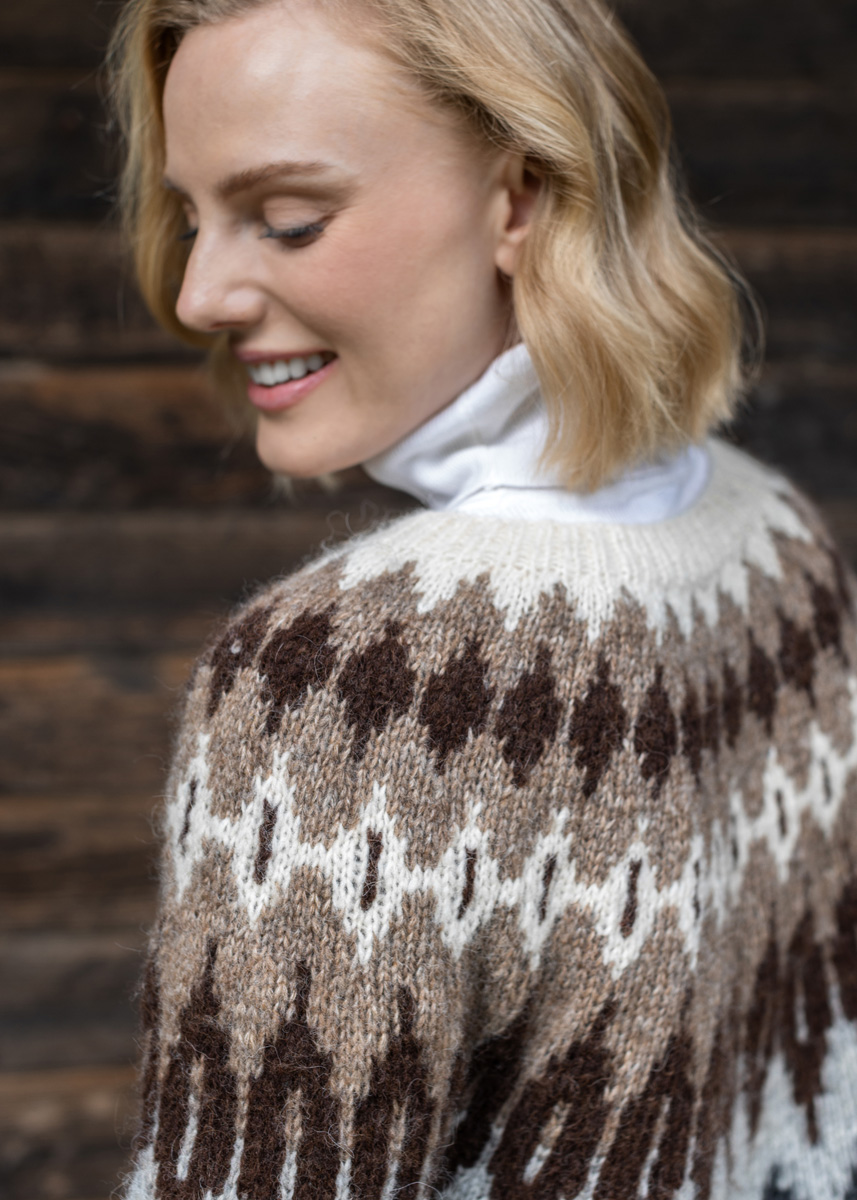 Der Cardigan wird in einem Stück von oben nach unten gestrickt. Er kann wahlweise klassisch (inklusive Blenden in einem Stück) oder als Steek Variante gestrickt werden. Dabei wird zunächst in Runden gestrickt. Am Ende werden die Ränder mit Kett-M gesichert, der Cardigan in der Mitte aufgeschnitten und die Blenden nachträglich quer angestrickt.