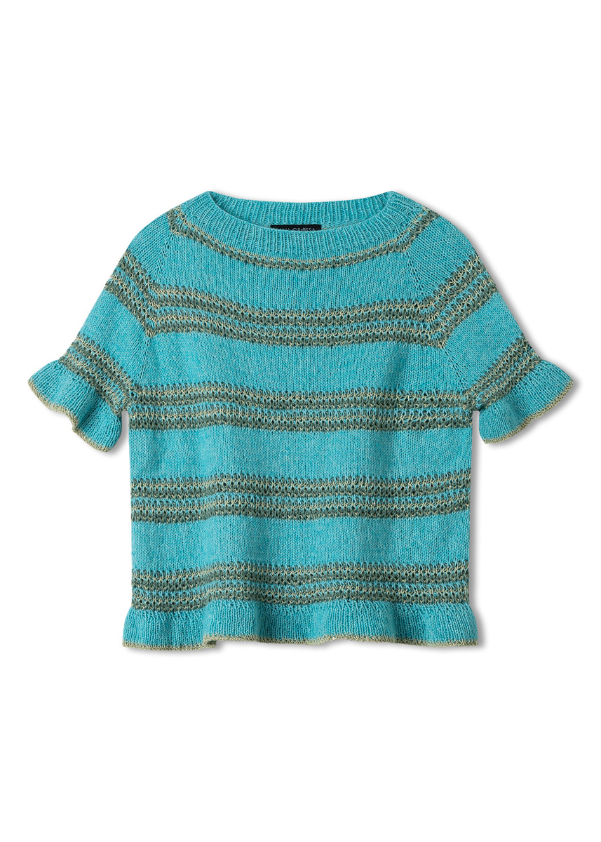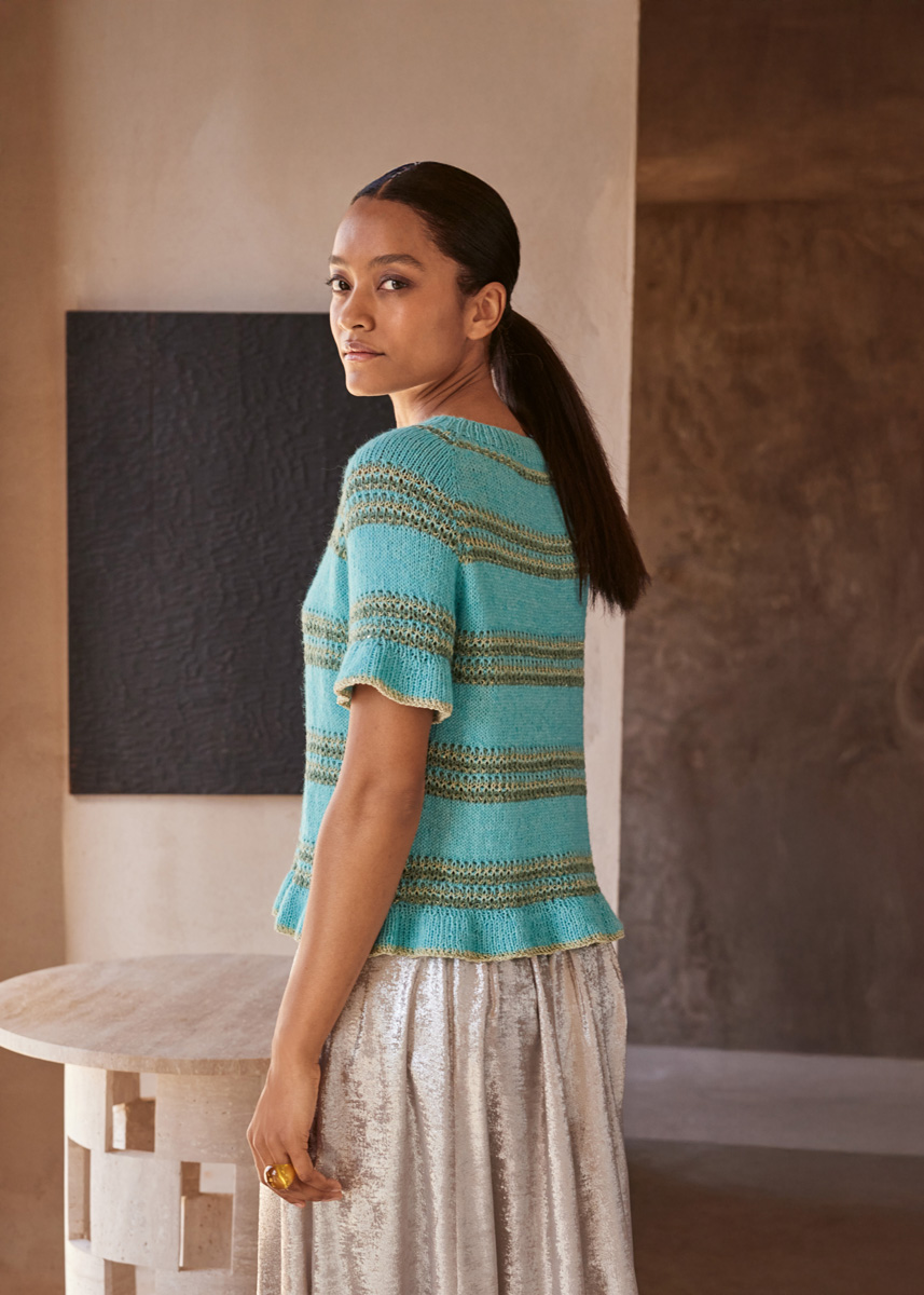 Hochklassige Garne, sanfte Volants und hier und da aufblitzende Pailletten machen das ebenfalls in Top-down-Methode gestrickte SHIRT zu einem Schmuckstück, das jedem Outfit elegante Akzente verleiht und tagsüber wie abends mit Stil punktet. A dopo!