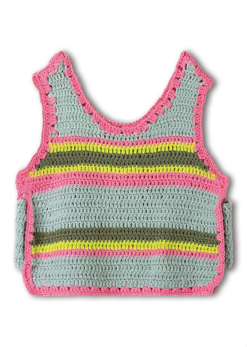 Lana Grossa Elastico (96% Baumwolle, 4% Polyester (Elité); LL = 160 m/50 g): 50 (100/100/100) g Graugrün (Fb. 120) und je 50 g Oleandergrün (Fb. 156), Bonbonrosa (Fb. 178) und Limette (Fb. 188); eine Häkelnadel 3,5 mm; 4 Nähclips (alternativ Stecknadeln).