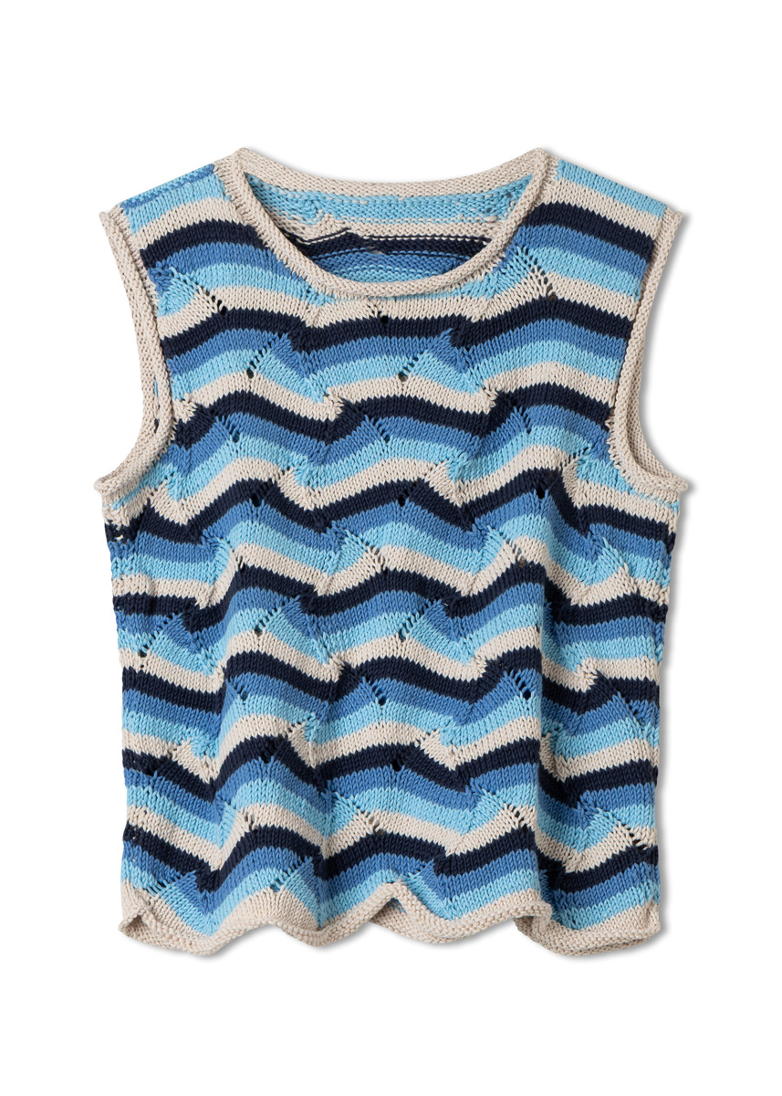 Die Rollränder erinnern an Schiffsschoten, das versetzte Lochmuster und die Streifen lassen uns an Boote denken, die sich zu einer Regatta versammeln. Für das maritime TOP aus Bio-Baumwolle ist zwar etwas Konzentration nötig, aber die lohnt sich – mehr Meer geht nicht!
