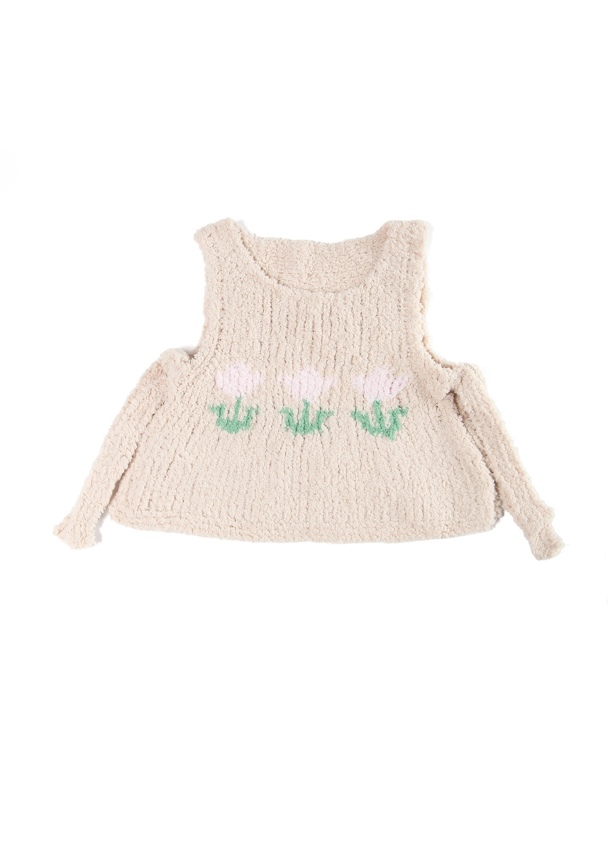 Lana Grossa Leggerissimo (100% rec. Polyamid); LL = 150m/50 g): 50 (50/50/100) g Hellbeige (Fb.16) und je 50 g Blassrosa (Fb. 7) und Mintgrün (Fb. 11); je eine Rundstricknadel 4 mm und 4,5 mm; Maschenmarkierer.