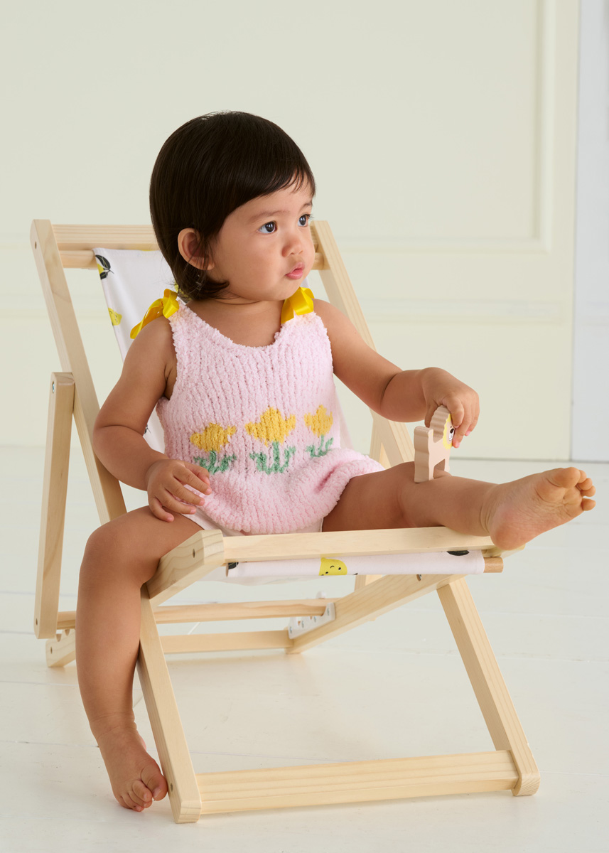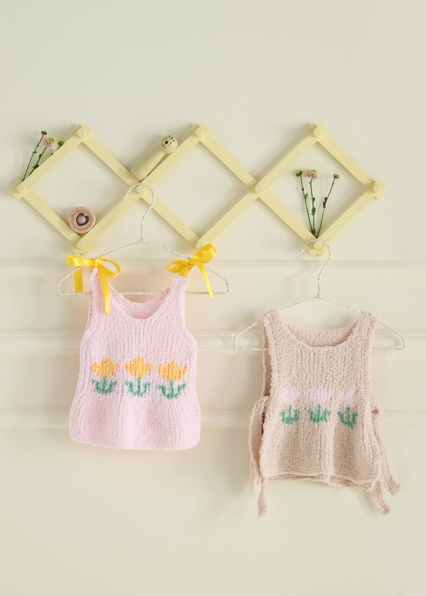 Lana Grossa Leggerissimo (100% rec. Polyamid); LL = 150m/50 g): 50 (50/50/100) g Blassrosa (Fb. 7) und je 50 g und Mintgrün (Fb. 11) und Gelb (Fb. 1); je eine Rundstricknadel 4 mm und 4,5 mm; Maschenmarkierer; 110 cm gelbes Satinband, 1,5 cm breit.