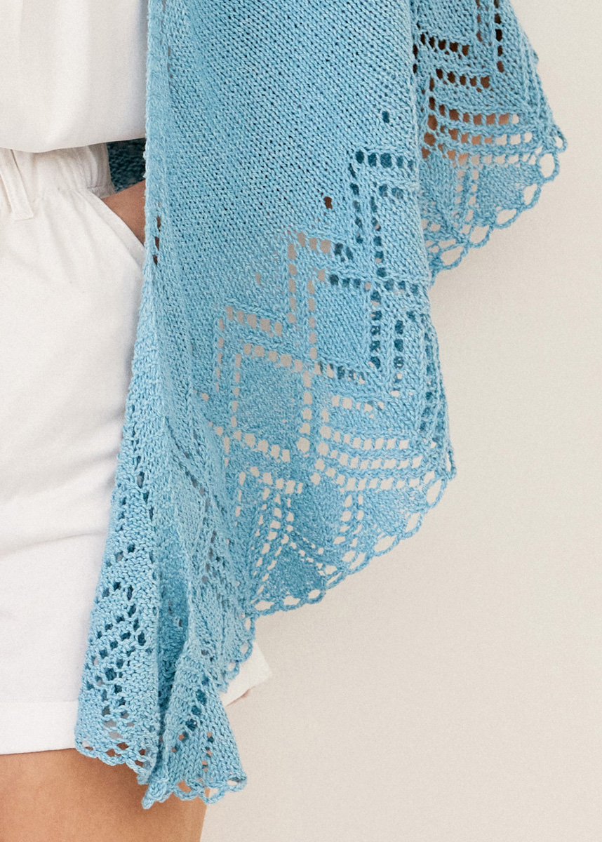 Für dieses Tuch brauchen Sie Lana Grossa Landlust Sommerseide (50% Seide, 50% Baumwolle, LL ca. 170 m/50 g), ca. 300 g Türkis (Fb 23); eine 80 cm lange Rundstricknadel Nr. 4, eine Häkelnadel Nr. 3, Stecknadeln und evtl. Spannstäbe zum Spannen.