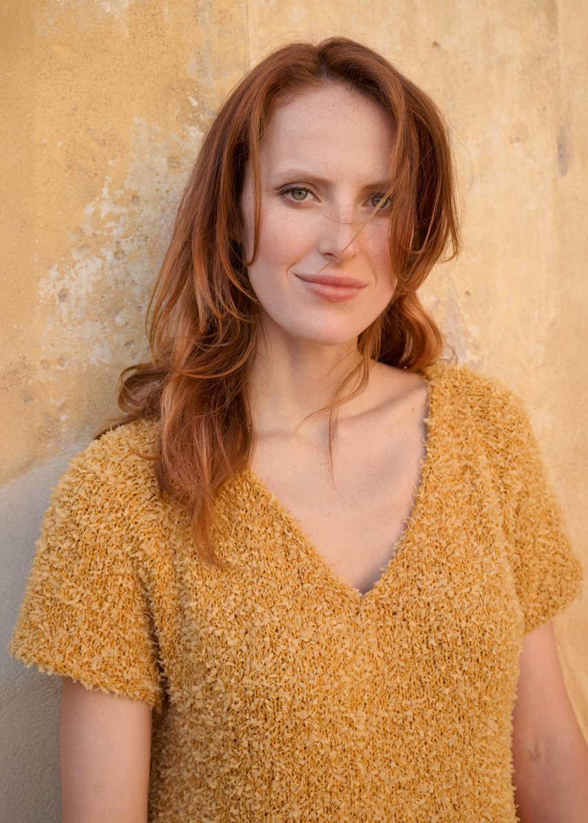 Lana Grossa-Qualität „Frizzante“ (54 % Baumwolle, 46 % Polyamid, LL = ca 105 m/50 g): ca 350 (400 - 450 - 500) g Ockergelb (Fb 2); kurze und lange Rundstricknadel Nr 5; Maschenmarkierer; Häkelnadel Nr 5.