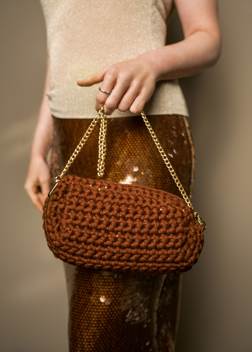 Lana Grossa „The Tube“ (60% Baumwolle, 40% Nylon, LL = 114 m/200 g): 200 g Dunkelbraun (Fb 29) und Lana Grossa „Glamour“ (55% Polyamid, 45% Polyester, LL = 115 m/25 g): 25 g Mokkabraun (Fb 14); Häkel-Nd Nr 6; 1 goldfarbene Metallkette mit Karabiner ca 90 cm lang und 1 braunen Reißverschluss ca 35 cm lang.
