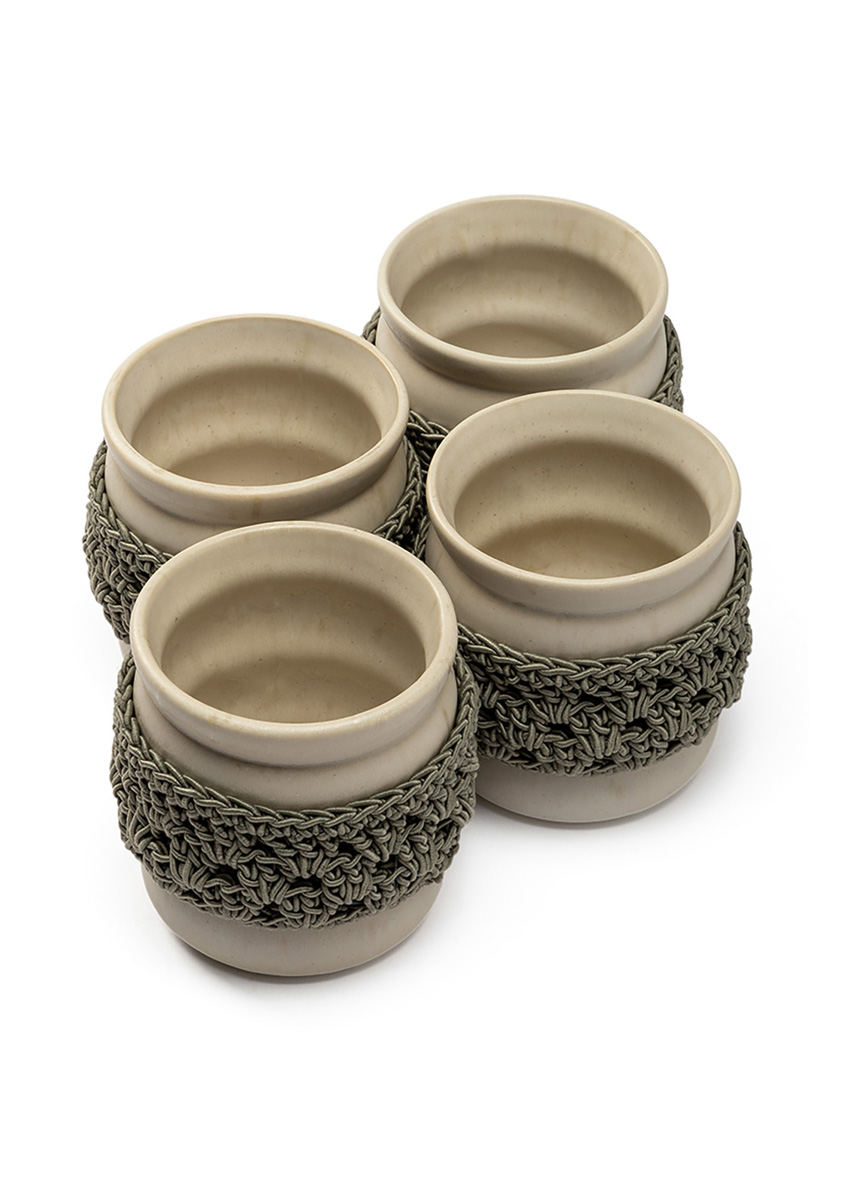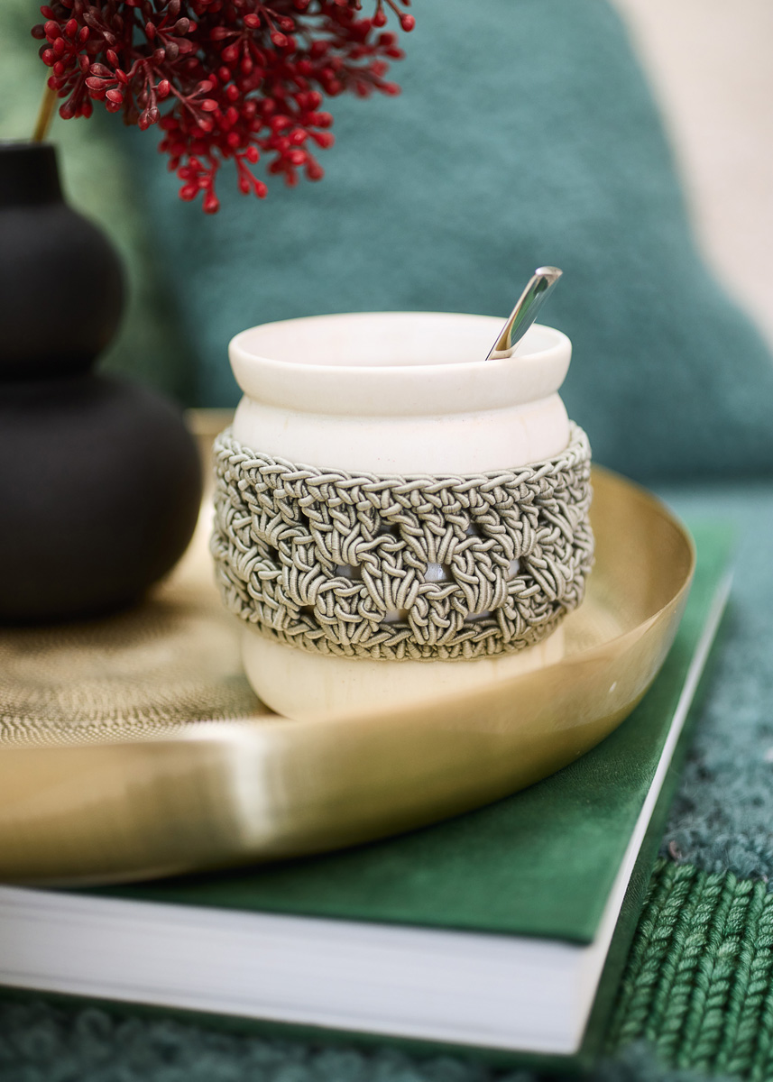 Lana Grossa-Qualität „The Core” (50 % Baumwolle, 50 % Polyester, LL = ca. 85 m/100 g): für 4 Becher: ca. 200 g Graugrün (Fb. 6); 1 Wollhäkelnadel Nr. 4,5; z. B. für 4 Motel a Miio Sintra Becher, groß Bubble, sand, ø 9 cm, Höhe 9,5 cm.