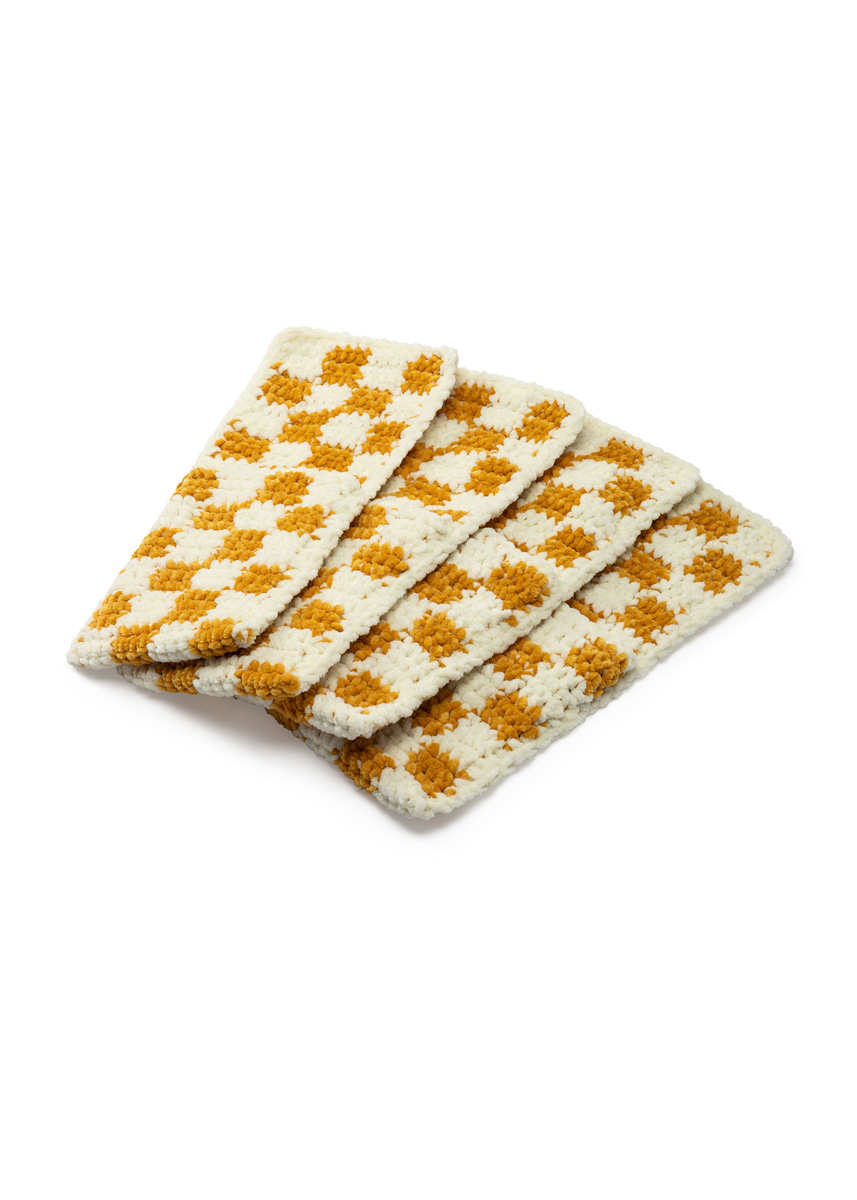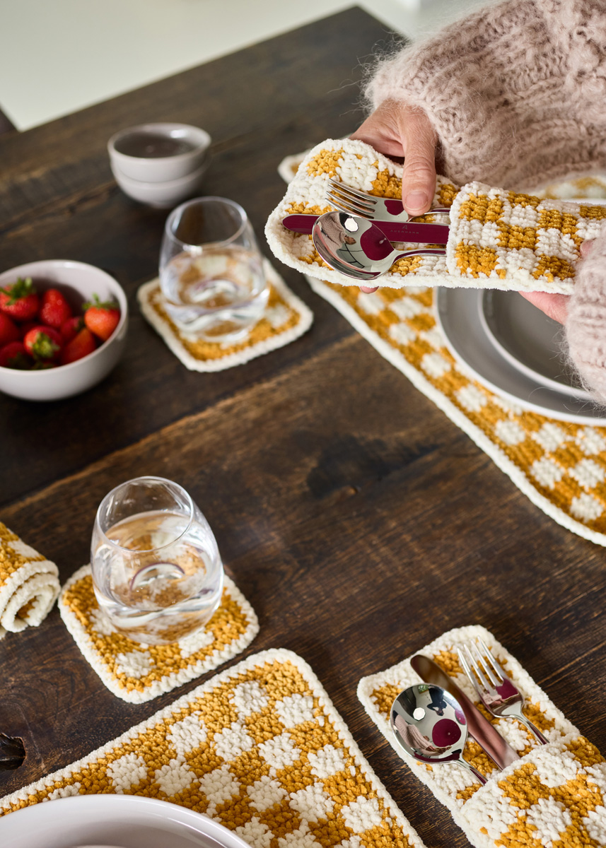 Lana Grossa-Qualität „The Look Fine” (100 % Polyester, LL = ca. 100 m/50 g): je ca. 50 g Creme (Fb. 102) und Rapsgelb (Fb. 128); 1 Wollhäkelnadel Nr. 4,5.