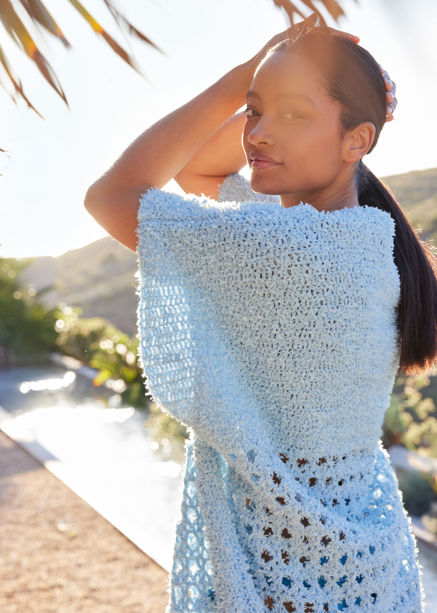 Lana Grossa Frizzante (54% Baumwolle, 46 Polyamid, Lauflänge 105 m/50 g), 700 g in Hellblau (Fb 8); Häkelnadel Nr 4,5 und Nr 5.