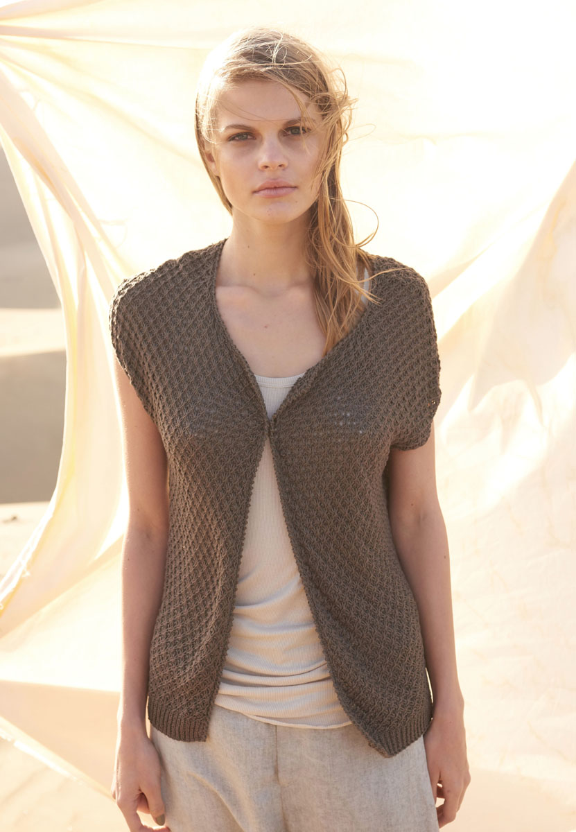 Lana Grossa Solo Lino (80 % recyceltes Leinen (Viskose), 20 % Leinen, Lauflänge 120 m/50 g) 300 (350 - 350) g Schlamm (Fb 7); Stricknadeln Nr. 3,5, 4,5 und 5,5, Häkelnadel Nr. 4,5.