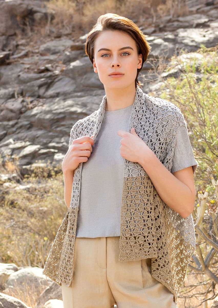 Lana Grossa Solo Lino (80 % recyceltes Leinen (Viskose), 20 % Leinen, Lauflänge 120 m/50 g) 250 (300 – 350) g Grüngrau (Fb 5) und 200 (250 – 300) g Schilf (Fb 8); Häkelnadel Nr. 4.