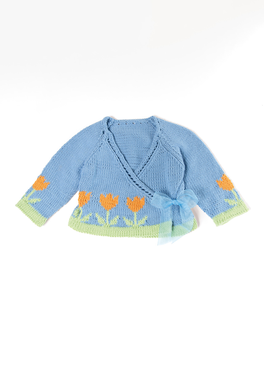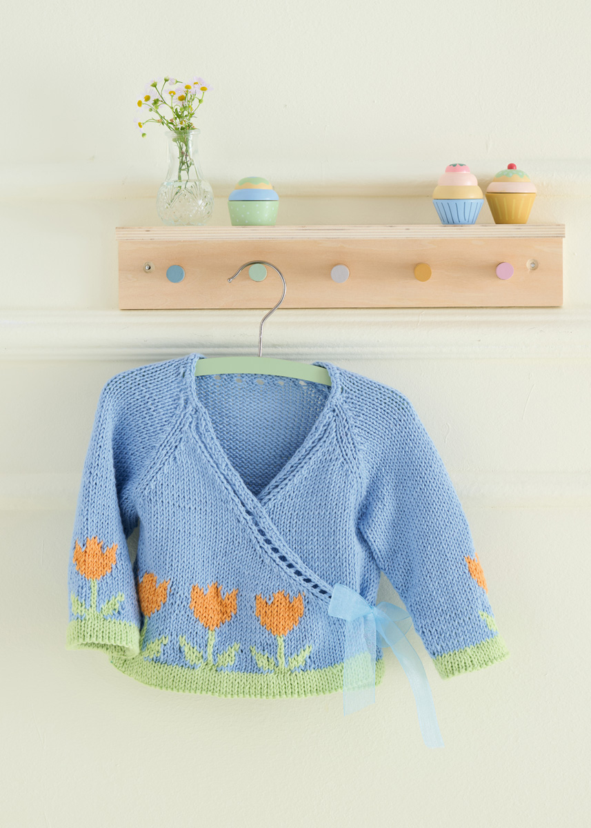Lana Grossa Soft Cotton (70% Baumwolle, 30% Polyacryl; LL = 140 m/50 g): 100 (150/150/200) g Himmelblau (Fb. 47) und je 50 g Lindgrün (Fb. 36) und Orange (Fb. 59); je eine Rundstricknadel 3,5 mm und 4 mm; Häkelnadeln 3 mm; entfernbare Maschenmarkierer (alternativ Sicherheitsnadeln); 80 cm Organzaband, 2,5 cm breit.