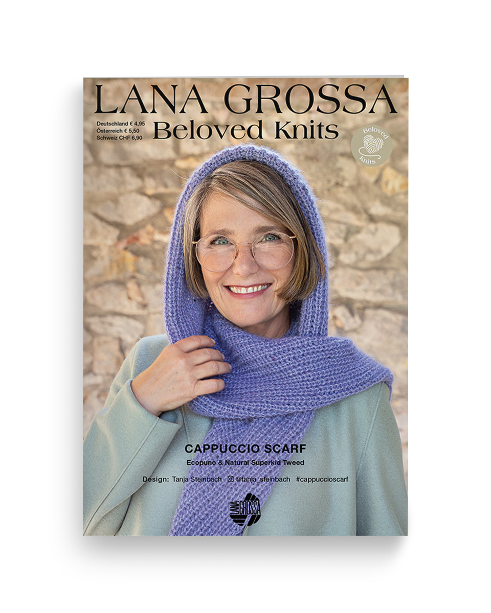 Der Cappuccio-Scarf wird nahtlos von den Schalspitzen bis zur Kapuze aufwärts gestrickt. Zunächst wird die linke Schalspitze im Halbpatentmuster mit doppelten Randmaschen an beiden Seiten und Zunahmen am rechten Rand gearbeitet. Dann werden die Maschen stillgelegt. Die rechte Schalspitze wird gegengleich mit Zunahmen am linken Rand gestrickt. Dann werden die Maschen beider Schalspitzen zusammengefasst, um über die gesamte Breite im Halbpatentmuster mit doppelten Randmaschen an beiden Seiten zu stricken. Für die obere Kapuzenrundung werden die Maschen in drei Teile geteilt, um in Hin- und Rückreihen über die Maschen des Mittelteils zu arbeiten und jeweils die letze Masche des Mittelteils mit der nächsten Masche des angrenzenden Seitenteils zusammenzustricken. Zum Schluss werden die Maschen der Kapuze mit einem schmalen Kordelrand abgekettet.