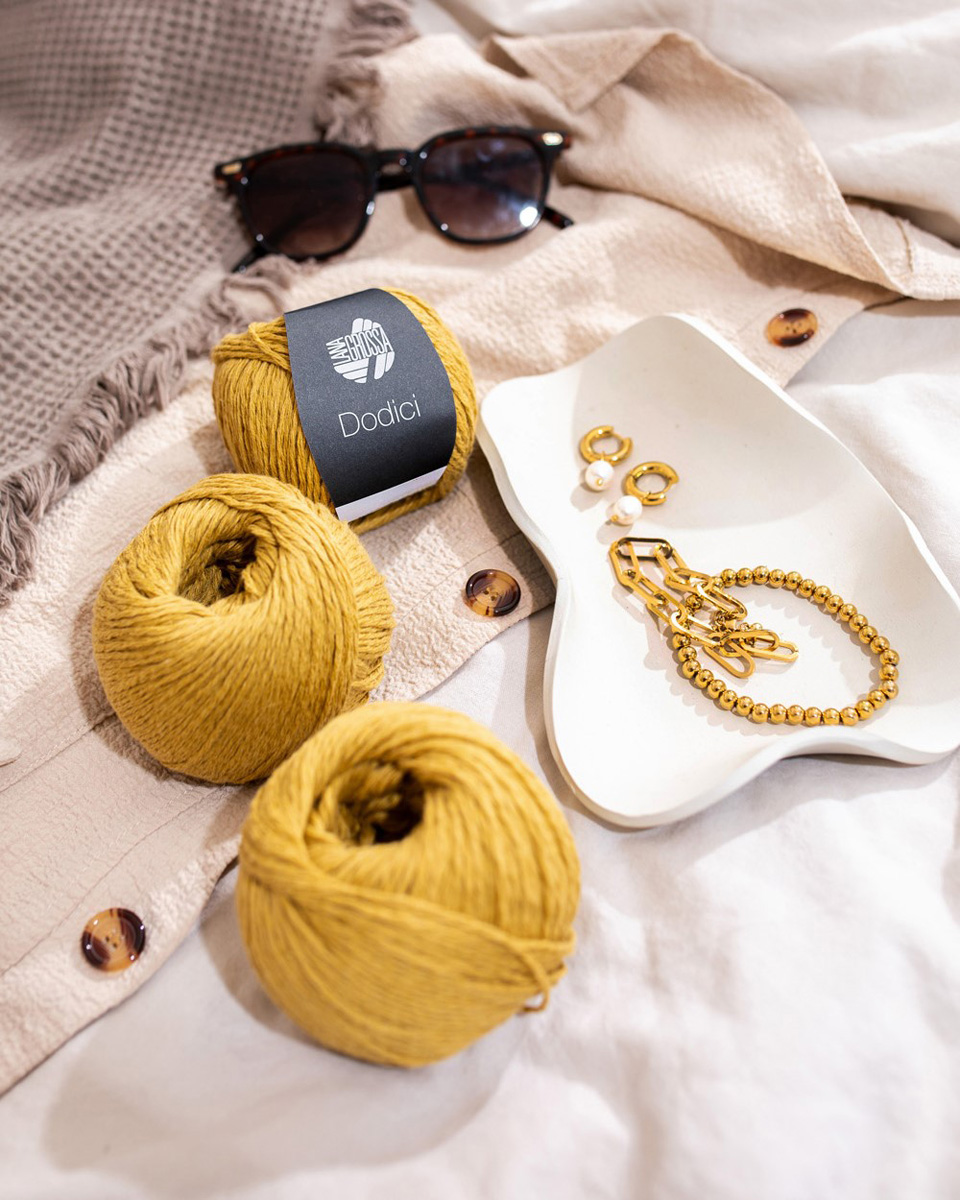 Dodici ist ein leichtes Sommergarn mit lebendiger Struktur und angenehm trockenem Griff. Die hochwertige Mischung aus Baumwolle, Viskose und Leinen sorgt für ein weiches Maschenbild mit natürlichem Charakter und dezentem Glanz.