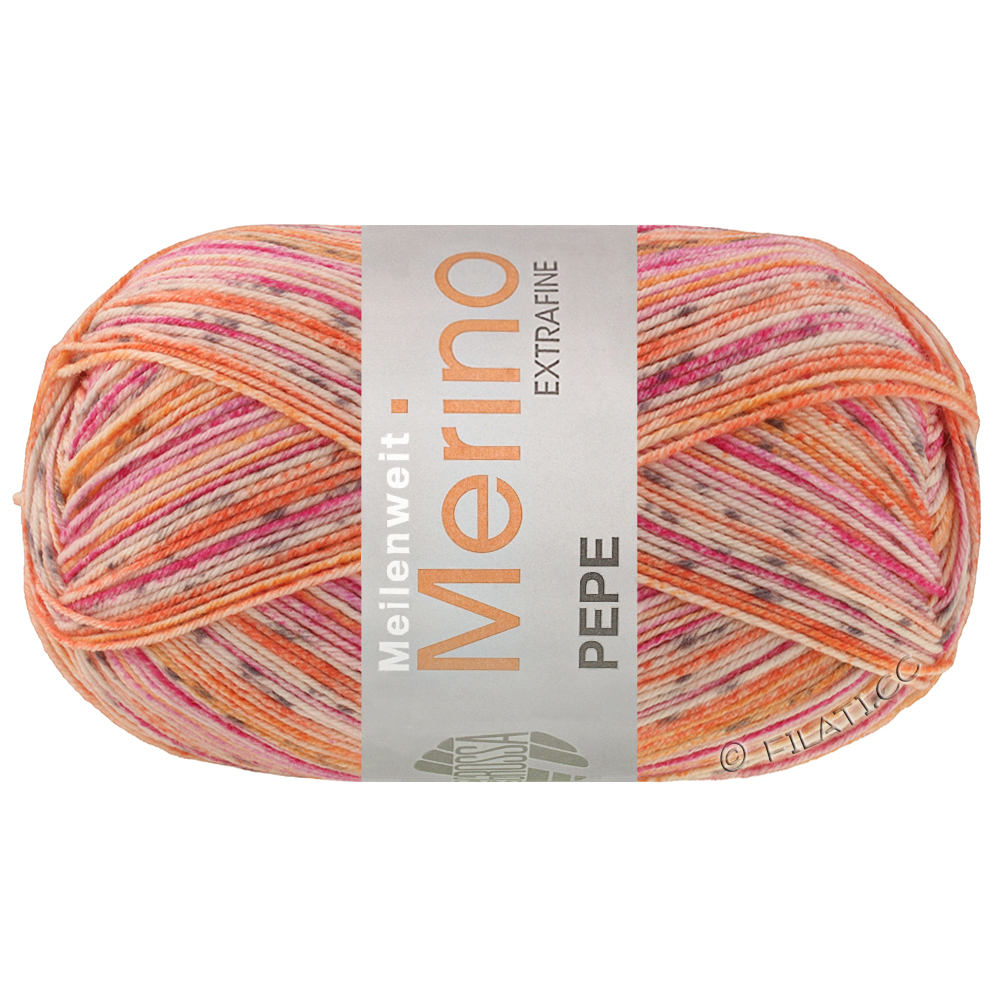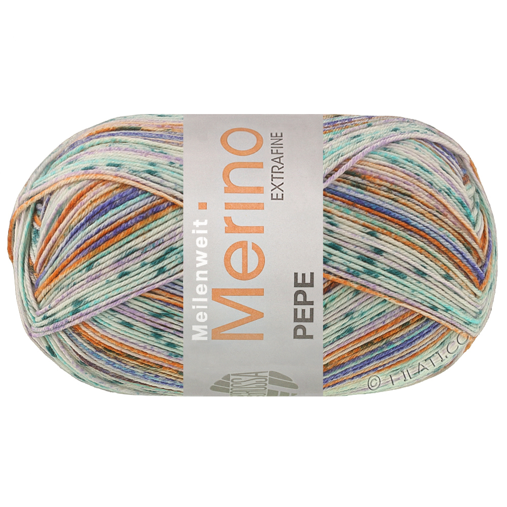Lana Grossa Meilenweit 100 Merino Extrafine Pepe überzeugt mit extrafeiner Merinowolle – weich, atmungsaktiv und angenehm wärmend. Das 4-fädige Garn ist ideal für hochwertige Socken.