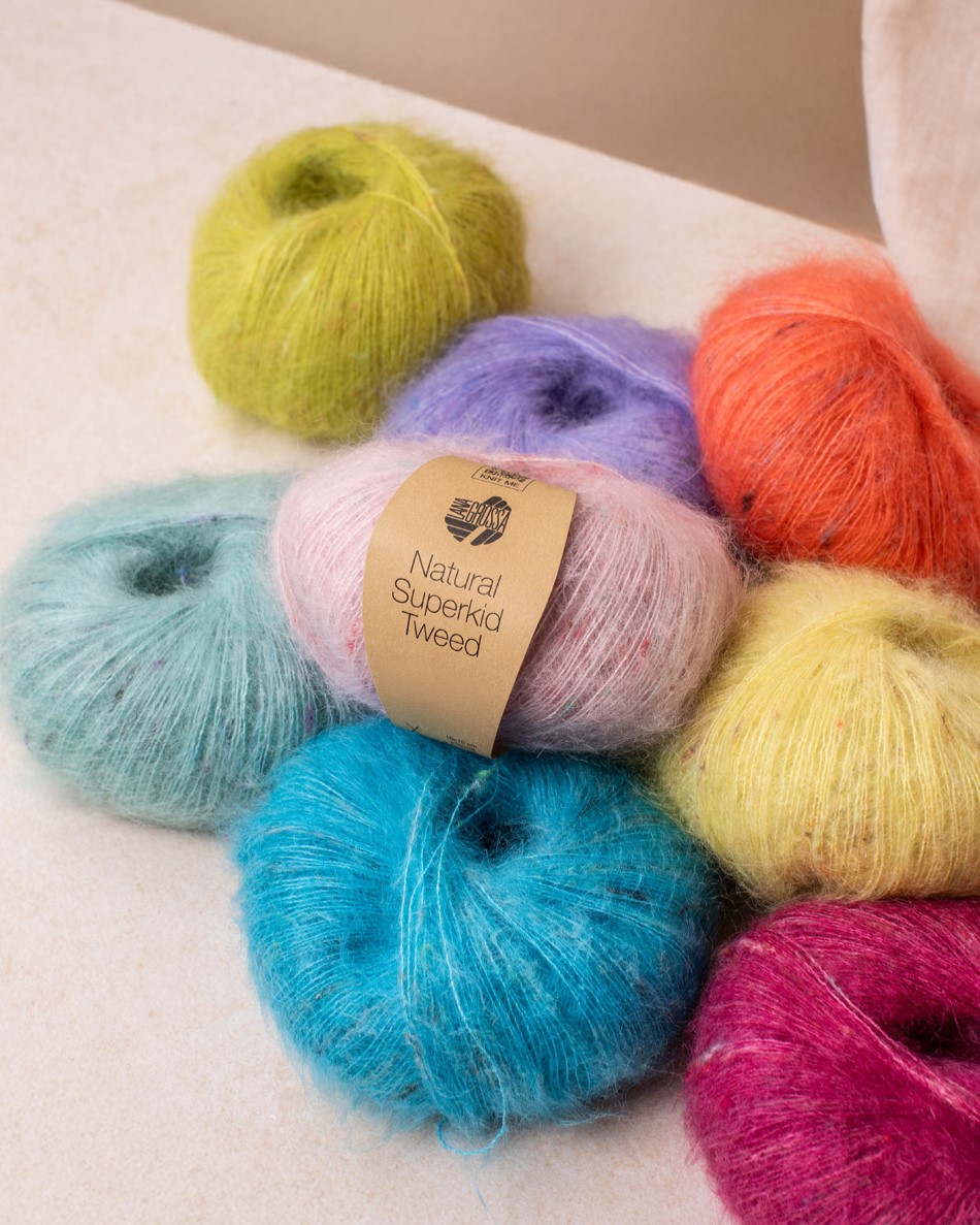 Natural Superkid Tweed vereint luxuriösen Mohairflausch mit einem charmanten Tweed-Effekt – für natürliche, edle Strickstücke mit rustikalem Touch. Die hochwertige Mischung aus Mohair, Wolle und Seide sorgt für Leichtigkeit, Wärme und ein sanftes Schimmern, während die feinen Tweednoppen dem Garn eine lebendige Struktur verleihen.