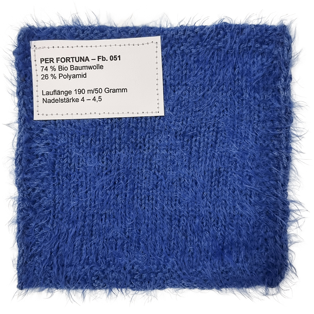 Per Fortuna ist ein nachhaltiges Kettengarn mit kuscheligem Flausch und besonders weichem Griff. Es wird aus Bio-Baumwolle und recyceltem Polyamid hergestellt und ist GOTS-zertifiziert – ideal für alle, die umweltbewusst stricken möchten, ohne auf Komfort zu verzichten.